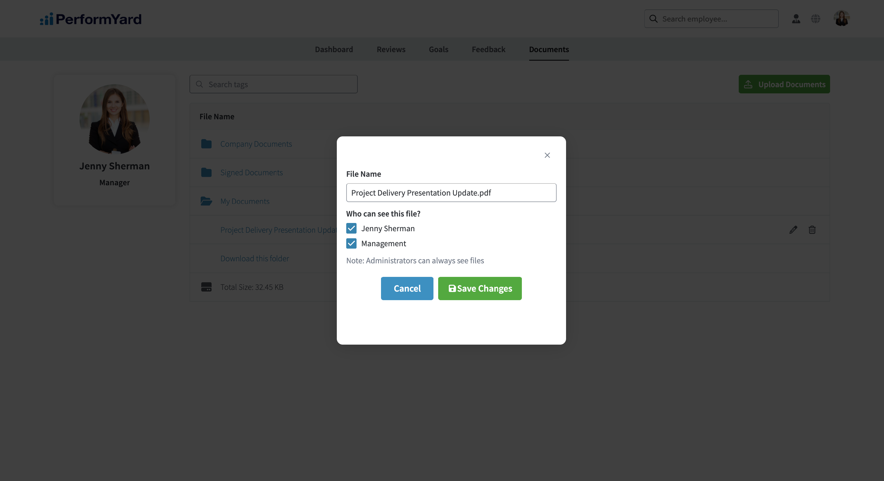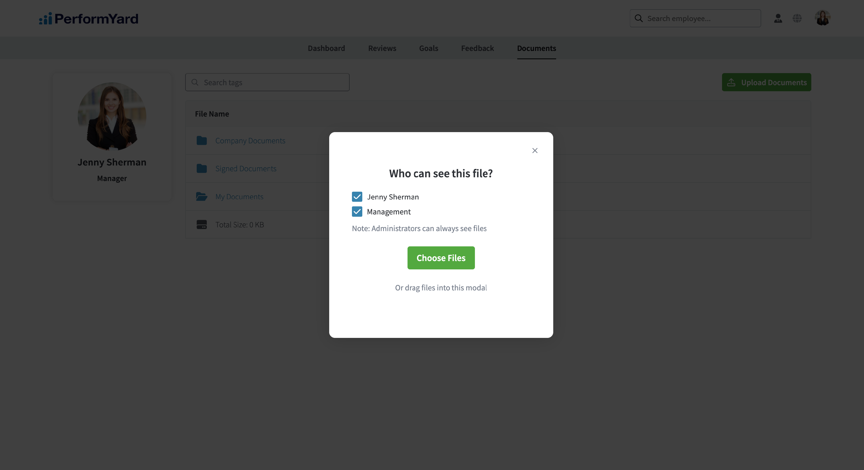 To add a document, click the Upload Documents button located in the top right corner of the Documents page. Before uploading, you'll be prompted to set view permissions for the file(s). You can choose whether your manager should have access to view and download the document. If you grant access to "Management," your assigned PerformYard manager, as well as their manager and others above them in your reporting chain, will be able to access the file from your Documents tab. Please note that system administrators always have access to view and download any uploaded files, regardless of permission settings. To upload your documents, either click Choose Files to select one or more files using the file picker, or simply drag and drop the documents directly onto the page.