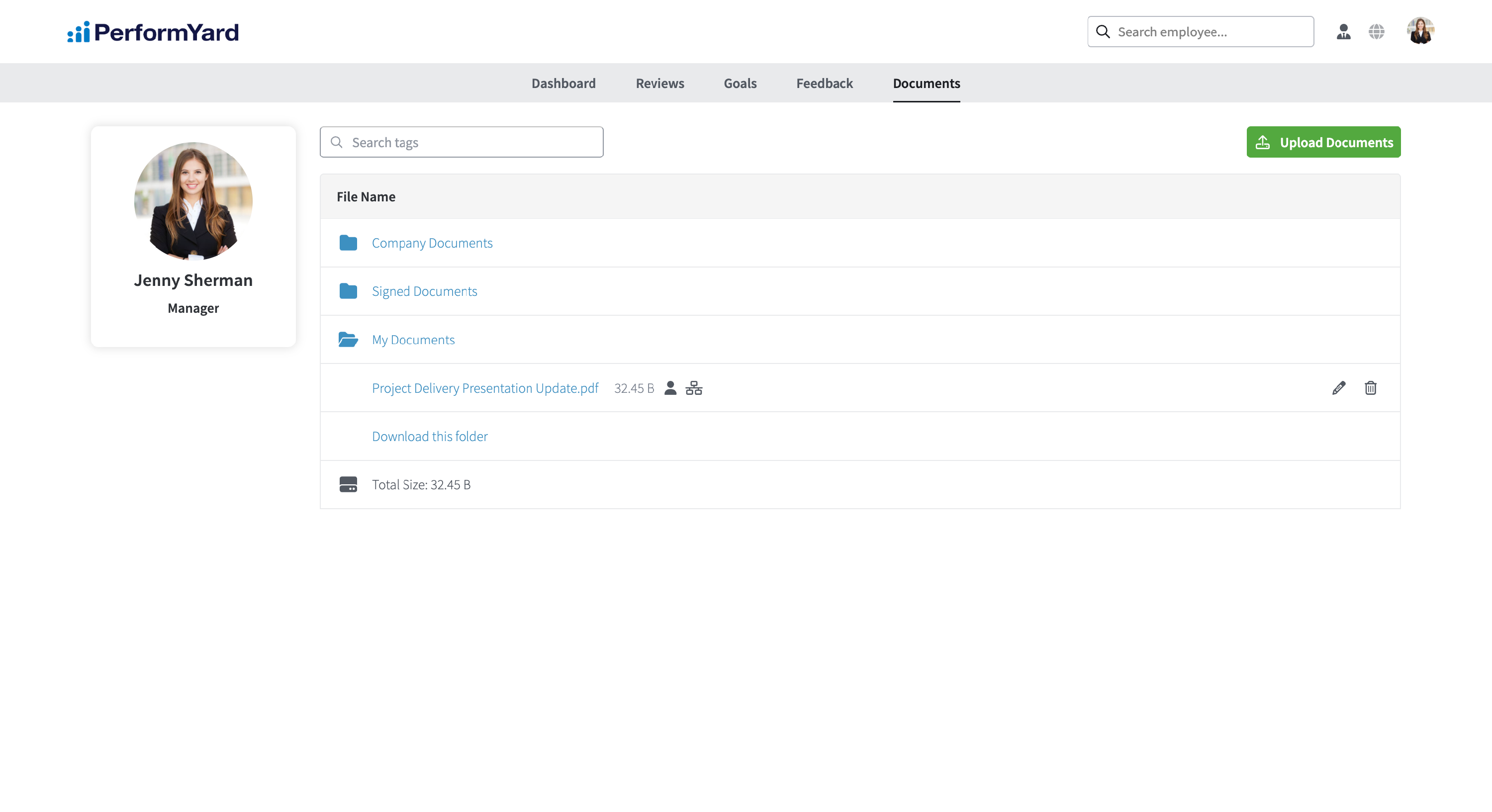 PerformYard allows you to upload and manage documents. These can include many different documents, such as past reviews, copies of feedback you have received, projects you completed or anything else you want to include. Additionally, you can access a set of company documents by clicking on the Company Documents link in your file list and you can download any signed documents you may have by clicking on Signed Documents.