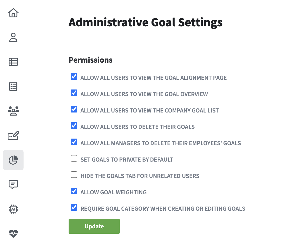 - Allow all managers to delete their employees' goals: This allows managers to fully delete goals for their team members, but only after archiving. Please note that enabling this permission will allow managers to completely remove a goal from PerformYard.
