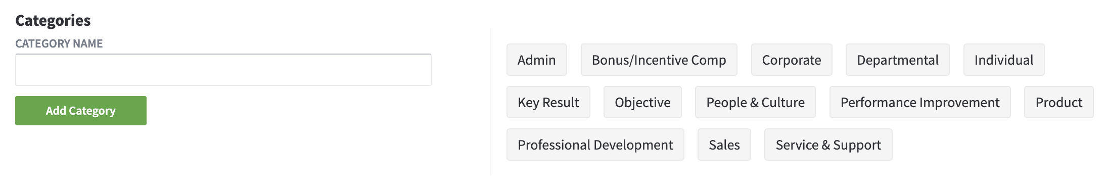You may edit or delete existing categories by hovering over the name of the category and selecting either the Pencil (to edit) or the X (to delete) [shown above to the right of Service & Support]. Editing will update all goals currently using that category. Deleting will not allow new goals to use that category, but will not remove it from existing goals.