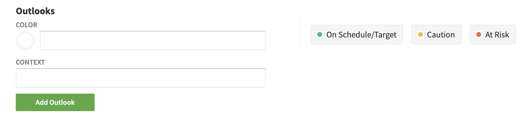 Outlooks include a combination of a color and associated words. PerformYard includes a set of defaults (On Schedule/Target with Green, Caution with Yellow and At Risk with Red). You may add new Outlooks by selecting a color (using the name of a color or its hex value) and providing the verbal context. Then click Add Outlook. To edit or delete an existing outlook use the Pencil or X found after hovering over the name [shown to the right of At Risk]
