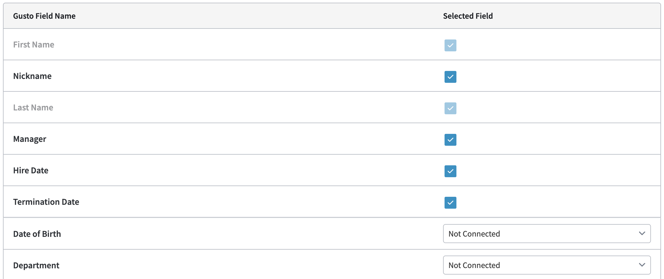 The initial step for connecting PerformYard and Gusto is to confirm the data fields you want to sync. First Name, Nickname and Last Name are required; other fields are not. If you choose to sync any other fields, note that those fields will be overwritten by data in Gusto for existing PerformYard accounts that you link and for newly created PerformYard accounts. You will no longer be able to edit these data fields within PerformYard, and they will be kept up to date based on data updates in Gusto.