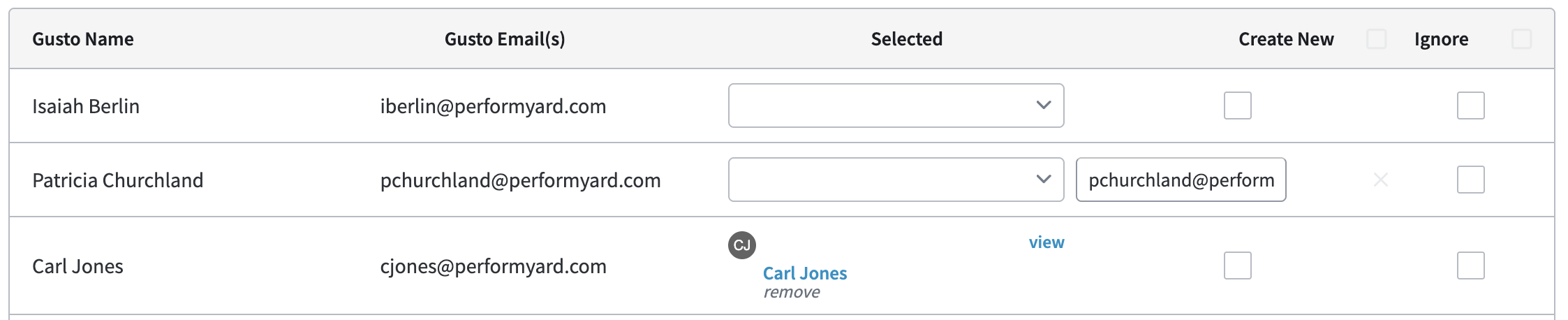 This page will show any Gusto employee that has not been matched with a PerformYard account. Going forward, newly added people to Gusto will appear in this list for action.