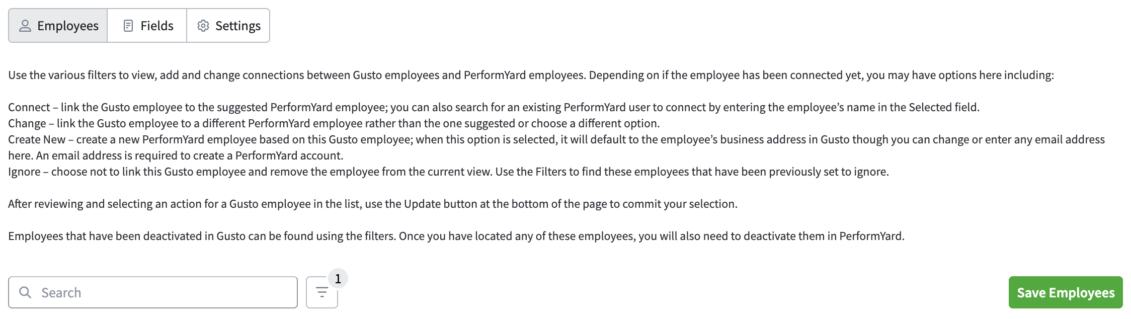 - Gusto employees previously set to Ignore will identify anyone you Ignored as one of the options above should you want to provide a PerformYard account in the future (or link to a PerformYard account).