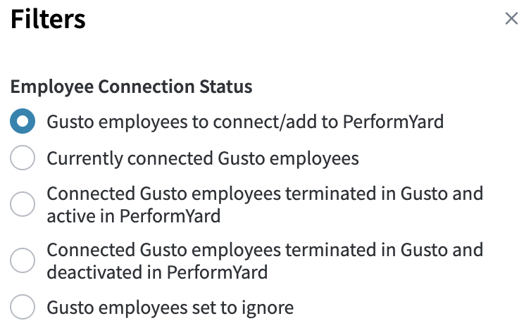 - Connected Gusto employees terminated in Gusto and deactivated in PerformYard. This list will show you those folks terminated in Gusto and deactivated in PerformYard. This list is typically for reference as no action is usually required.