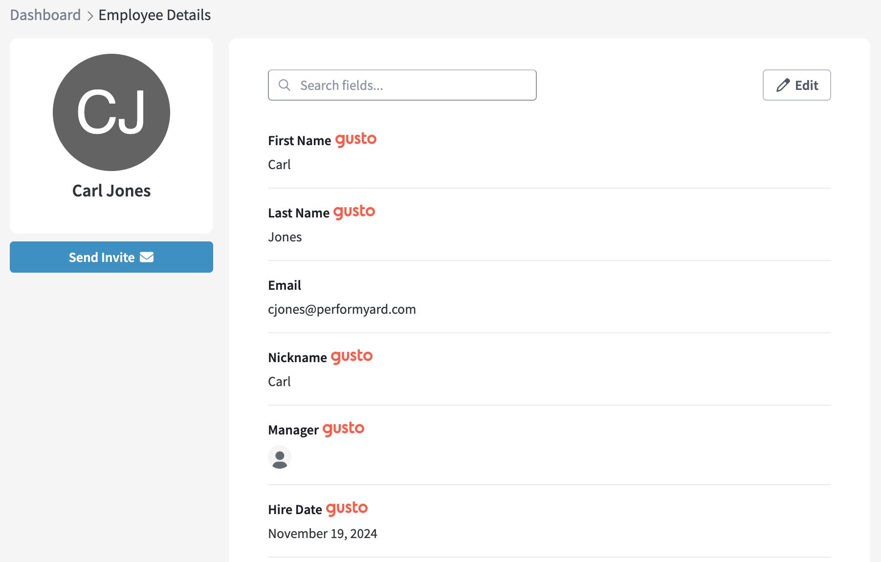 As mentioned, when a user is connected with Gusto, you will not be able to edit their information in PerformYard. The below screenshot demonstrates how those data fields will appear when attempting to edit that user.