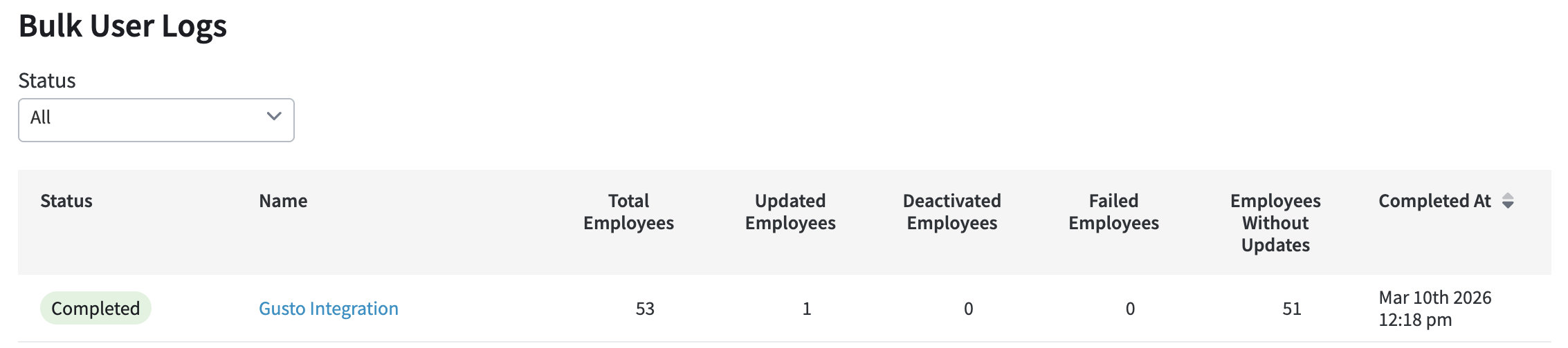 Once you have connected employees, you can view the Bulk User Logs, accessible from the Administration Section, to see any updates or errors that may have occurred. These logs provide statistics about those connected employees - how many were connected, updated, failed or did not have updates.