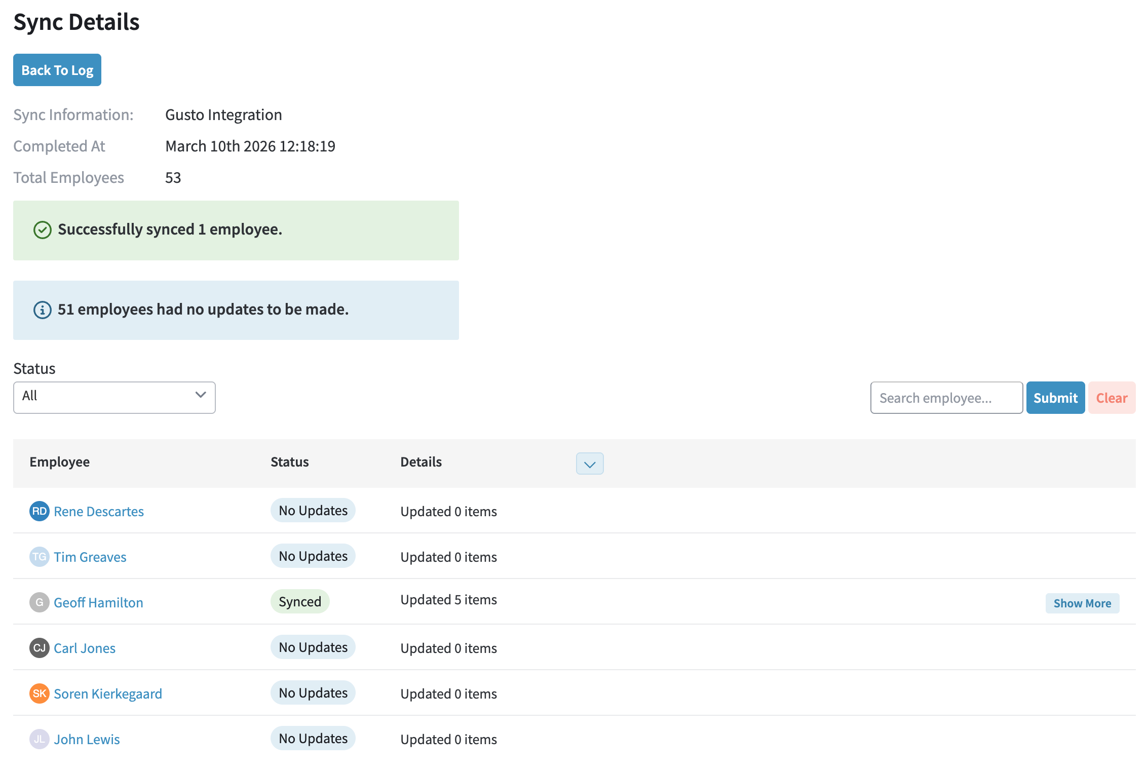 Select any log to view details of what occurred in that integration sync, where you can filter by status as needed. Any errors for individuals will be noted here with a reason. To view data that was updated for any employee, return to the Reporting section within Company Info and select the Recent Changes report.