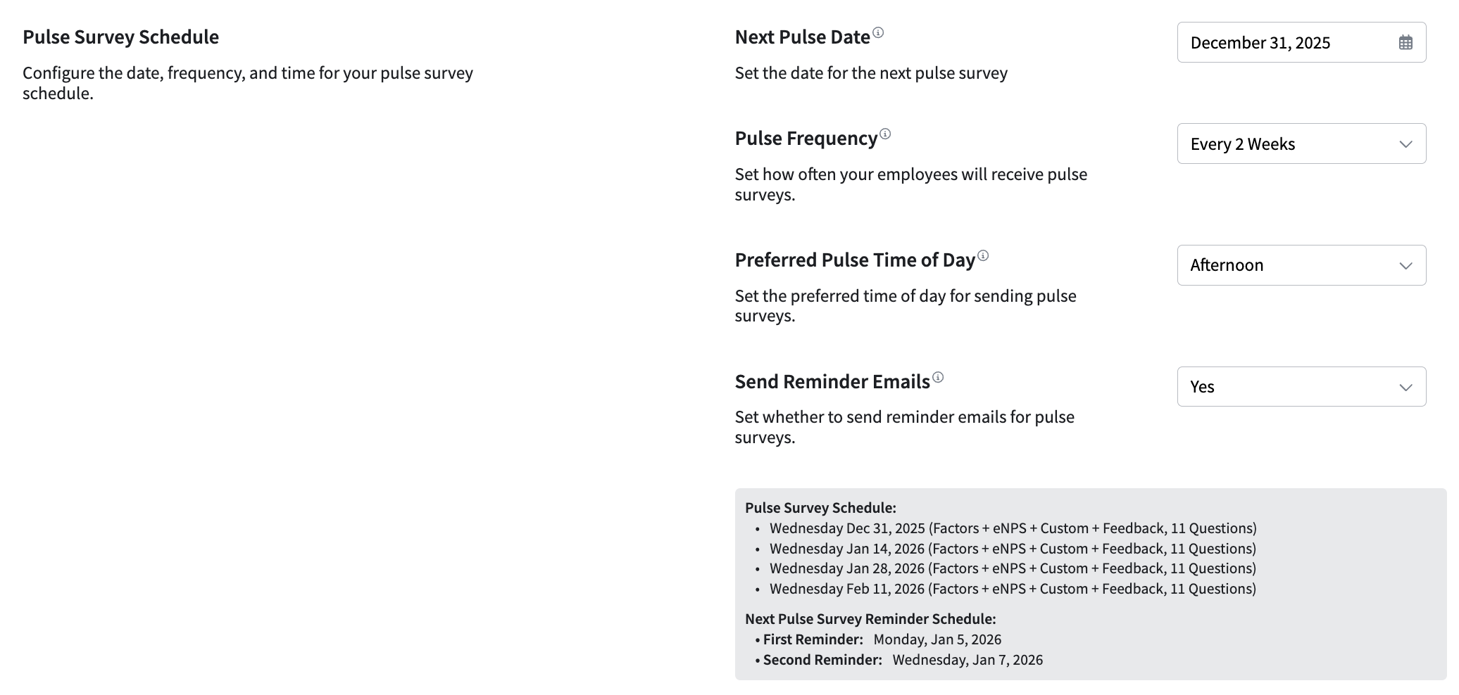 PerformYard will default to sending the next survey the day after enabling pulse surveys when no prior survey has been sent. Setting a specific next survey date establishes the first date in the recurrence for the selected survey frequency. The small schedule preview display will show the expected dates for the next four surveys based on the selected settings.