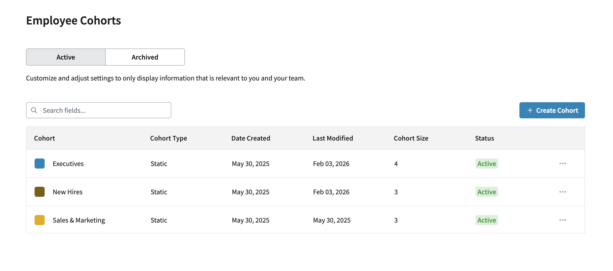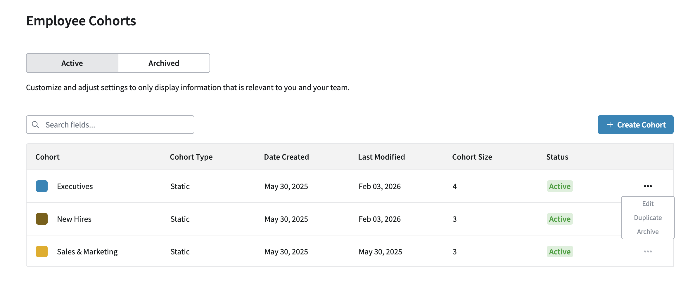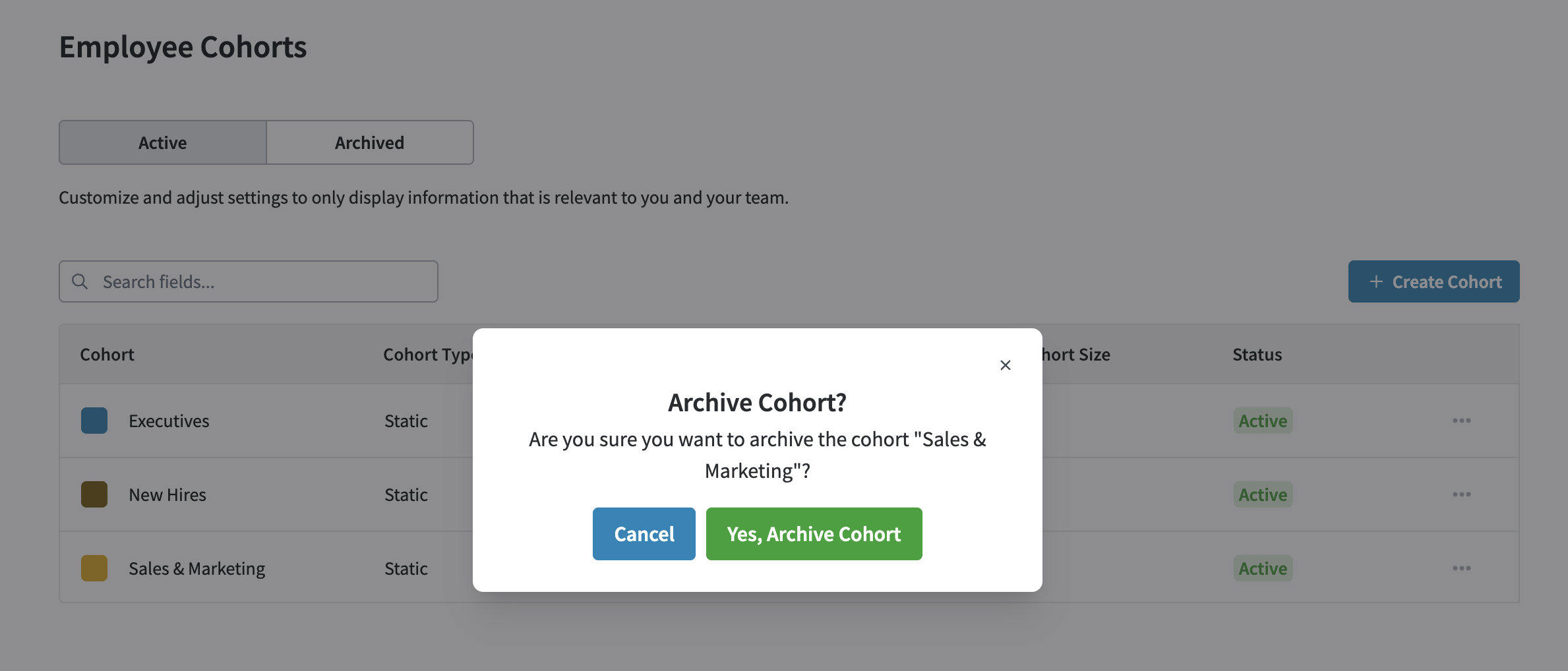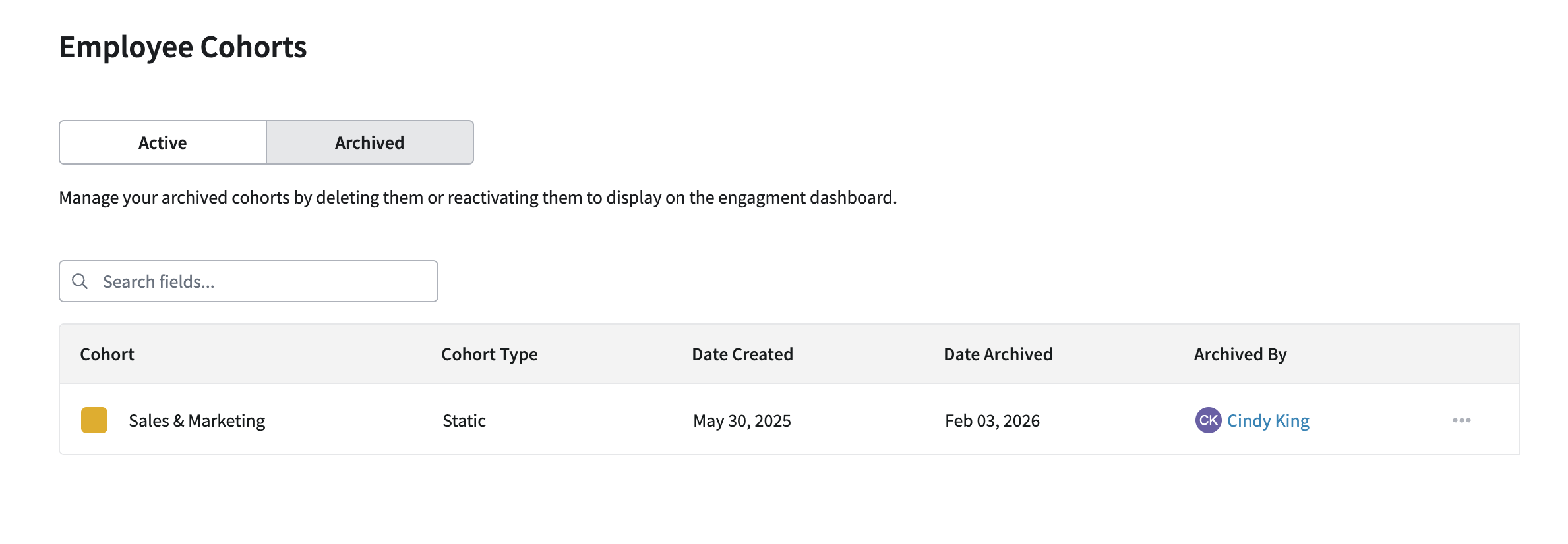 In addition to editing, PerformYard also offers the ability to archive and delete cohorts. If an active cohort is no longer needed, you can archive it to remove the group from your dashboard reporting. To archive a cohort, click the action menu in the cohort row and select Archive. You can view the list of archived cohorts by navigating to the Archived tab at the top of the Employee Cohorts page.