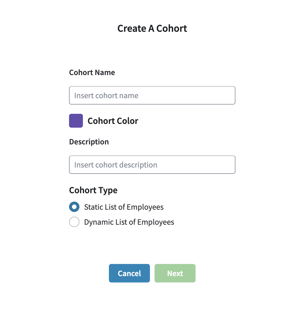To create a new static employee cohort, you'll need to provide four pieces of information: