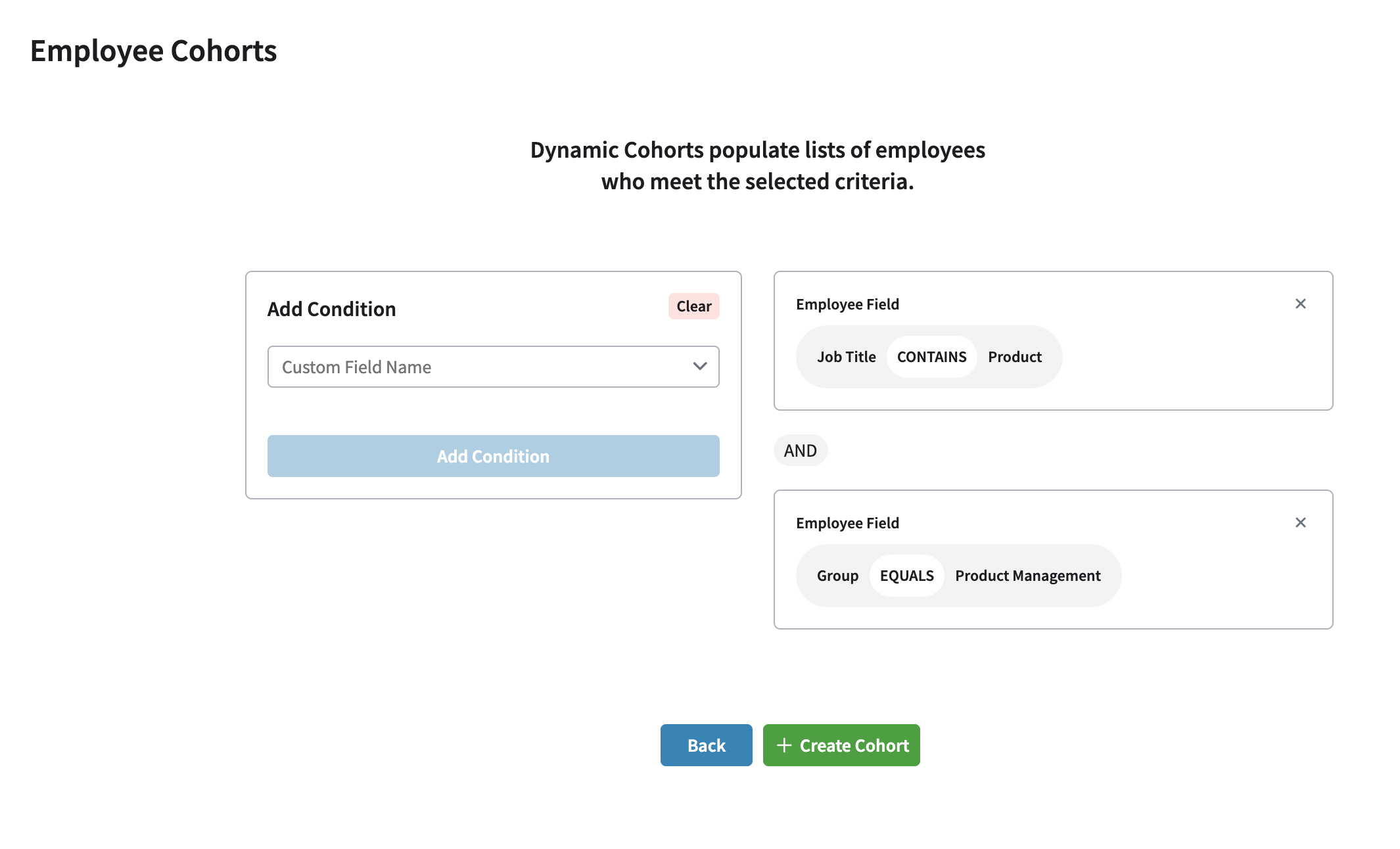 | Cohort Conditions | A set of filter conditions on employee attributes to narrow down the list of employees for the cohort. For example, Employee Group Equals "Marketing."