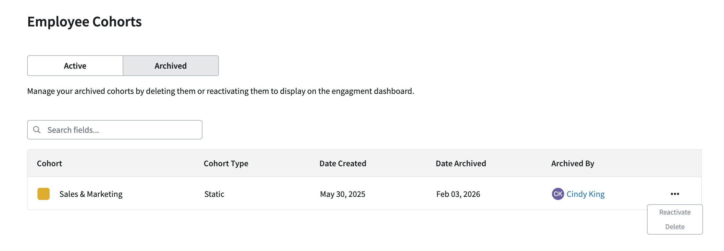To add an archived cohort back to your dashboard and start measuring its engagement data again, you can restore the cohort by clicking the action menu and selecting Reactivate. The module allows an organization to have up to 100 archived cohorts at a time. To delete a cohort entirely, select the option to Delete. It is important to note that cohorts cannot be recovered once they've been deleted.