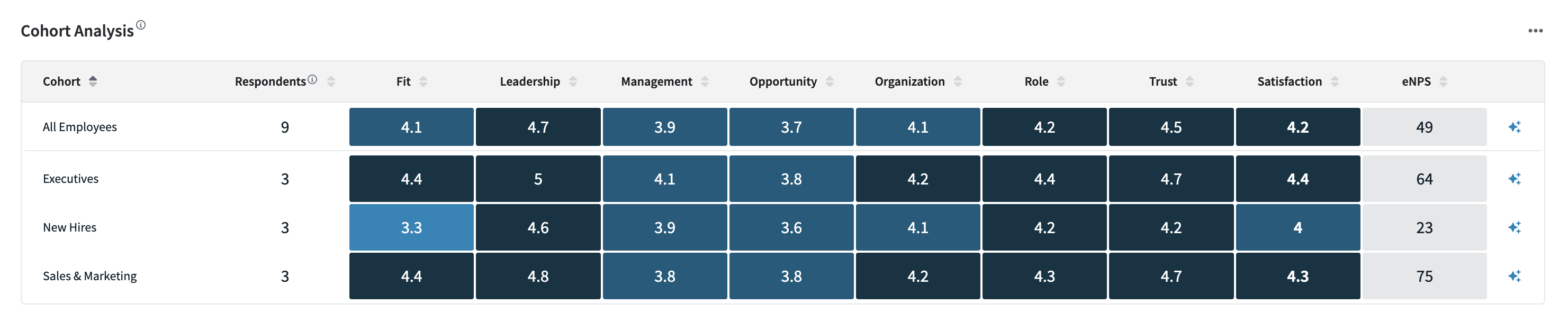 The column headers can initiate column sorting to more easily discover which cohorts are more or less satisfied or engaged on certain factors. You can also hover over the cells in each factor column to see the unique respondent count and number of responses that make up the reported score.