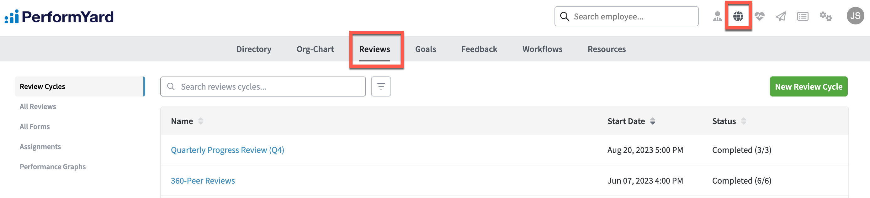 Note: You can filter the cycle list to show only active cycles by clicking the filter button to the left of the green New Review Cycle button.