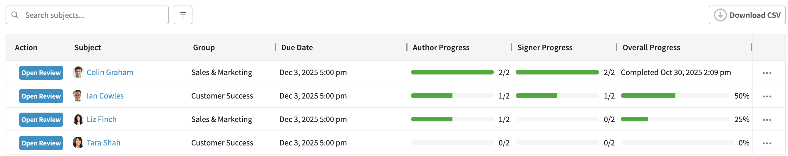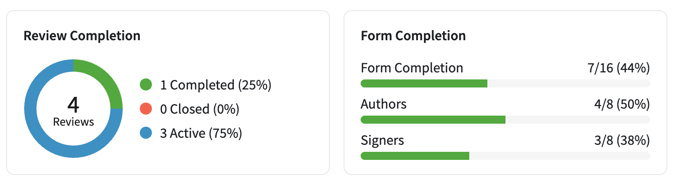 From the cycle detail page, check for completion to see where incomplete reviews are stuck. They could be incomplete by authors, signers or both. The pie chart below can tell you how many subject’s reviews are complete. Next to the chart, you can see how many forms, author tasks, and signer tasks are completed.