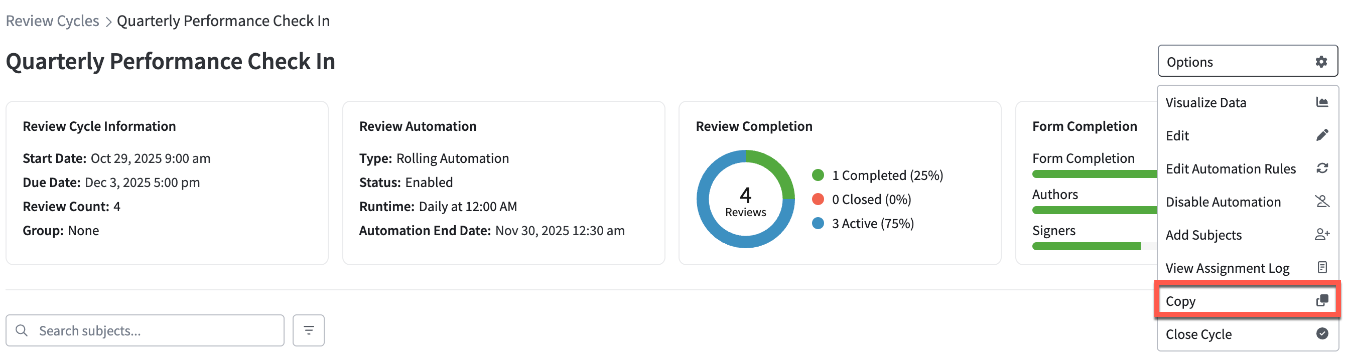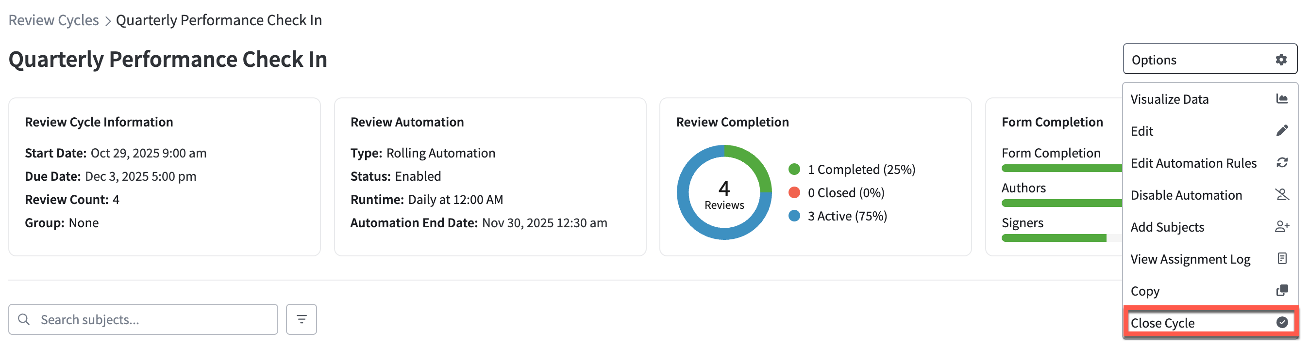 If all your reviews within your cycle are complete, you will not see Close Cycle under the Options menu. This is expected as the Close Cycle function is to close out reviews still in process.