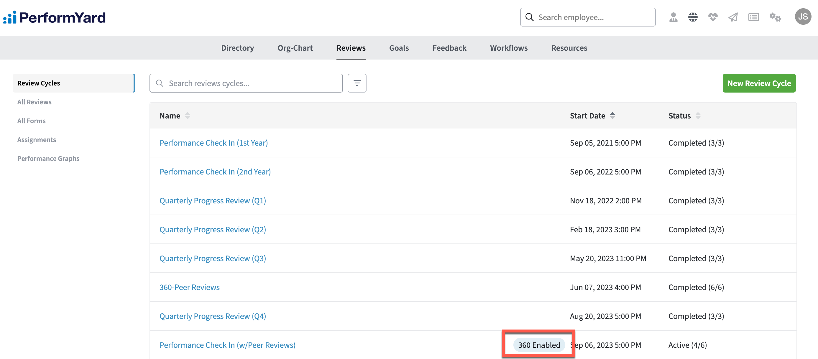 When you look at your cycle list, any cycles with the 360 Enabled badge indicate there are 360 forms within the cycle that are able to be assigned.