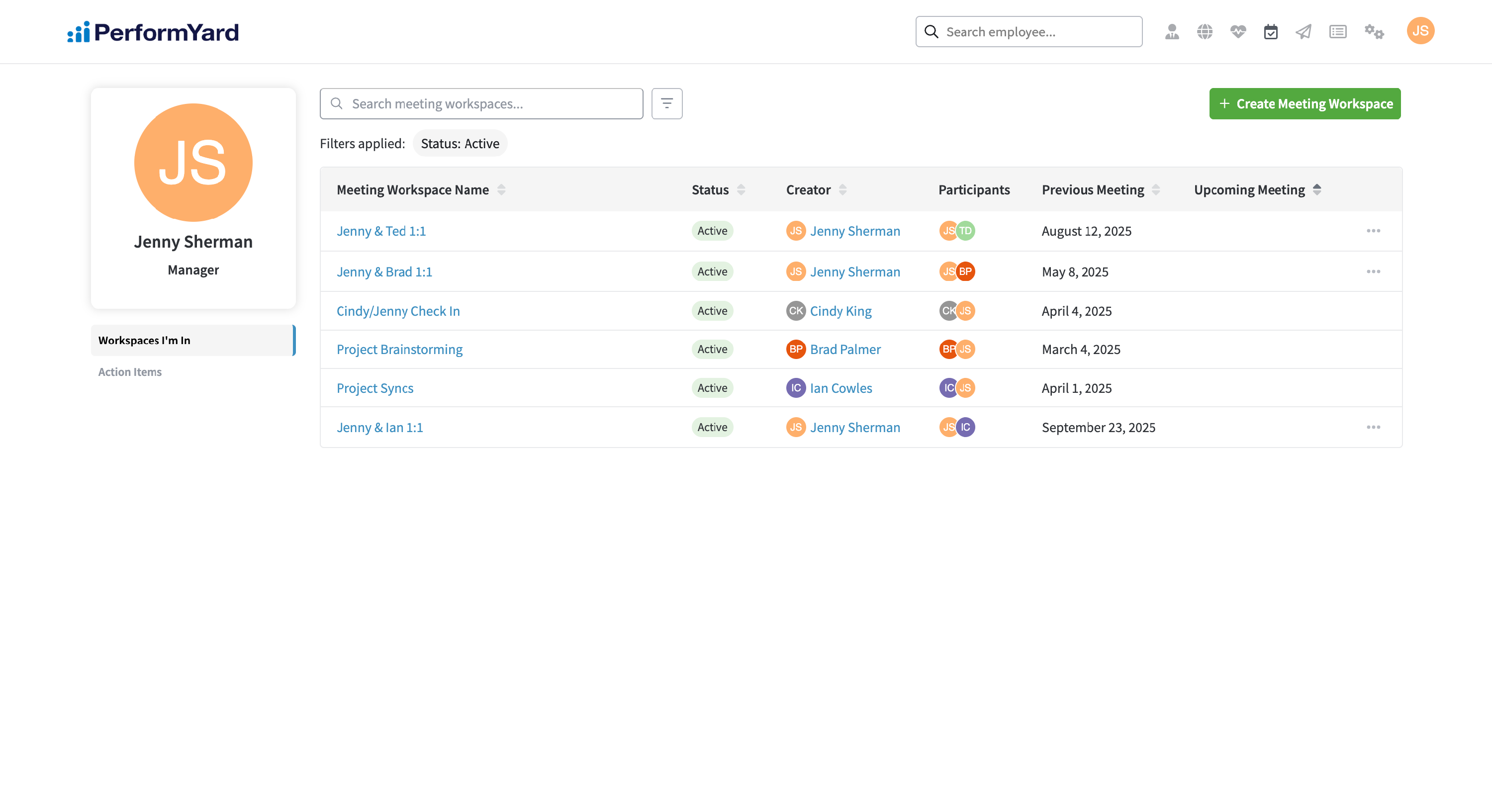 In PerformYard Meetings, you’ll start by creating a meeting workspace. Each meeting workspace enables two users to create and access meetings, fostering seamless collaboration between them. Meeting workspaces can be created by anyone in your organization, and they can include any colleague, not just direct reports or team members. Think of meeting workspaces as a collection of your meetings. For example, if you have a weekly 1:1 with one of your direct reports, you can create a dedicated meeting workspace to store all those meetings in one place. Each week, as the meeting takes place, both you and your direct report can take notes, add agenda items, and track action items. With all these elements being stored together, revisiting past discussions, seeing decisions made, and who needs to do what is quick and effortless!