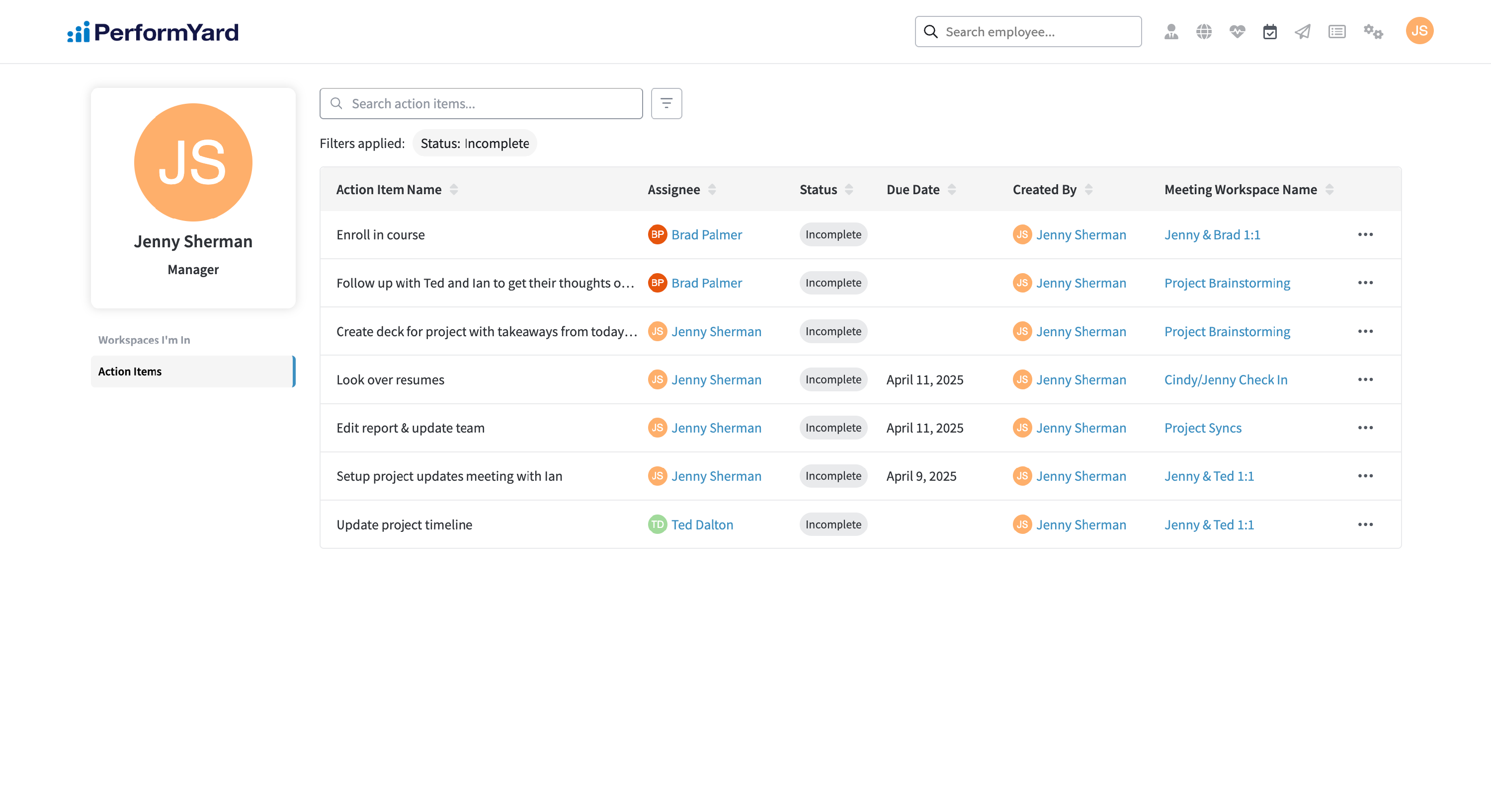 Meetings are crucial for fostering communication, collaboration, and alignment within a company, ensuring that everyone is on the same page regarding goals and expectations. They provide a dedicated space to discuss challenges, share updates, and make decisions that drive the company forward. PerformYard Meetings allows employees to streamline their meetings by introducing collaborative agendas, action items, and note taking all inside a meeting workspace that allows you to view past meetings with ease.