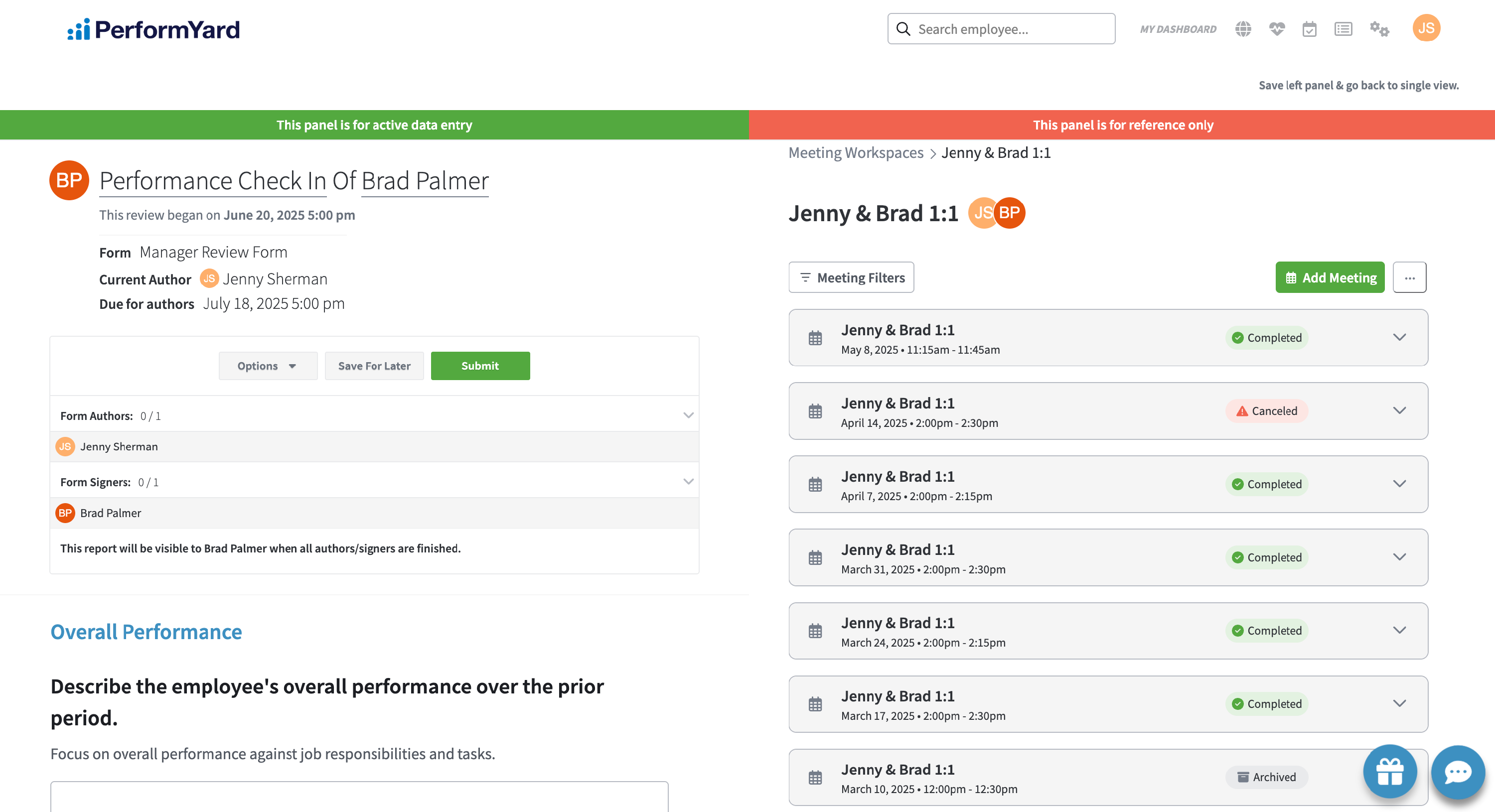 In order to assist with the performance review process, PerformYard allows for meeting workspaces to be accessed while filling out a performance review using its dual view capabilities. This ensures that the review is informed by previous discussions, helping to track improvements, and areas of focus over time.