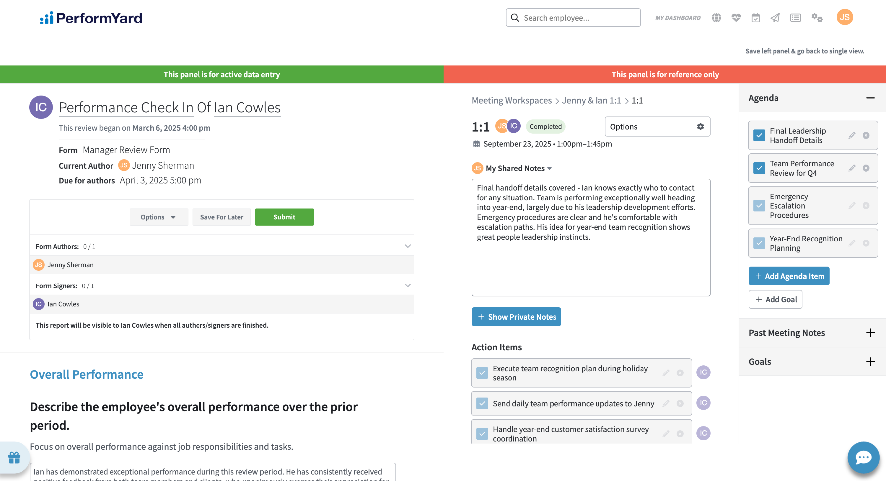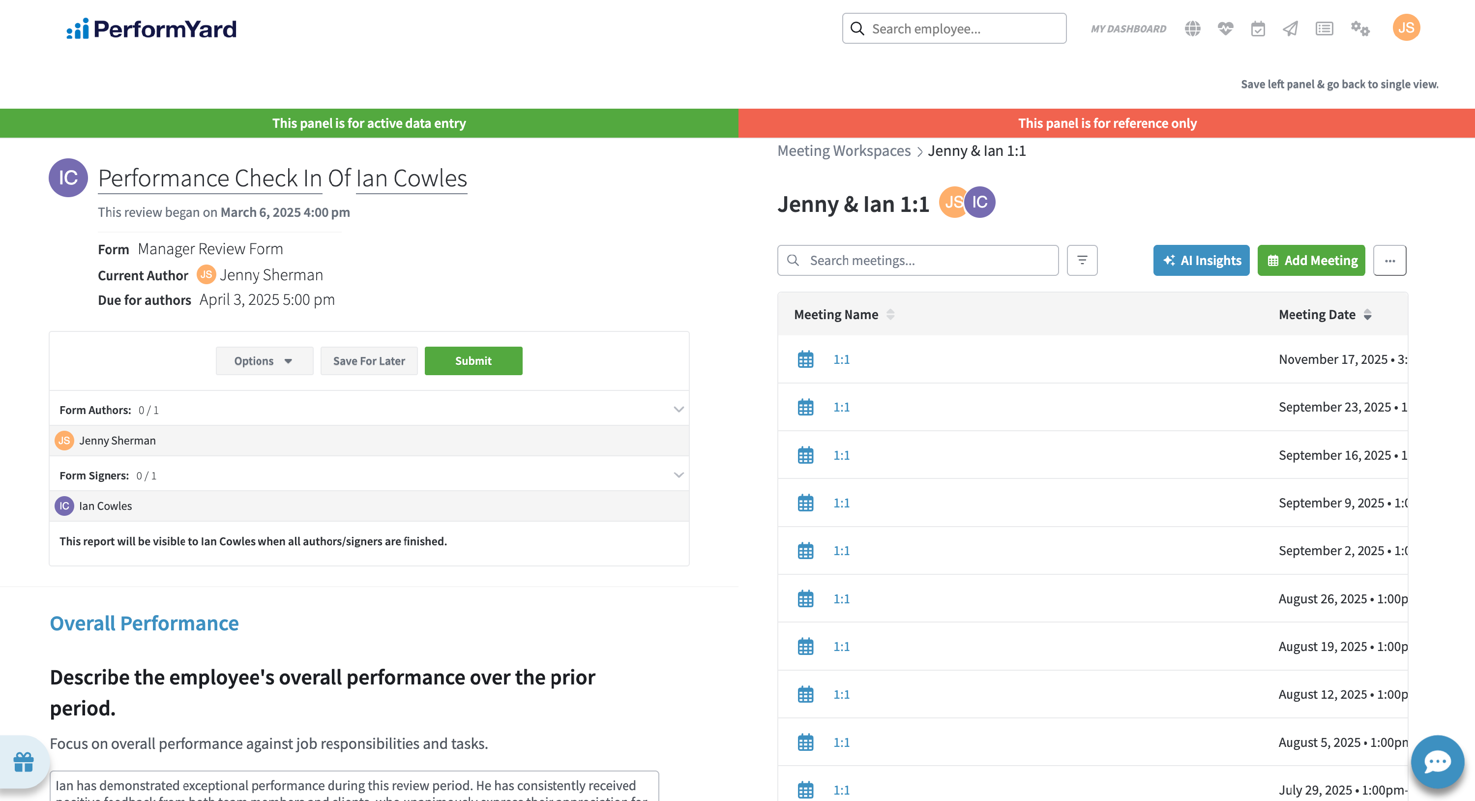 This will bring up our dual view feature with your performance review form on the left and PerformYard Meetings on the right. We'll automatically filter your meeting workspaces to only ones with the subject of the review, making it easier to access the meetings that are relevant. Using the right side panel, navigate to a relevant meeting workspace. You should now be able to look back at previous meetings and their notes, action items, and agenda items.