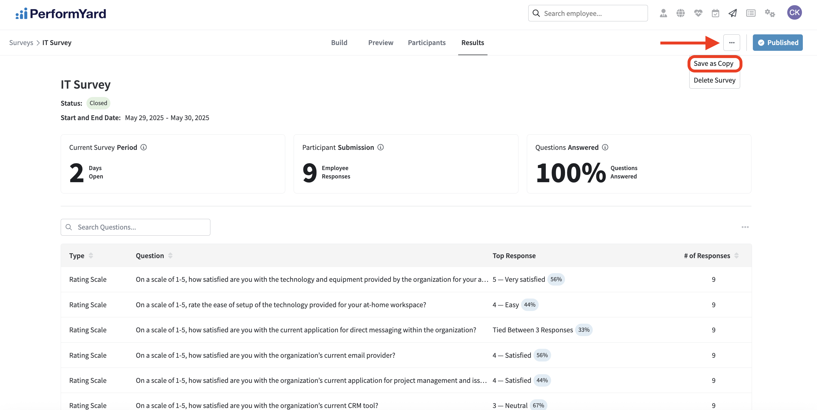 Admins can also create new surveys by copying an existing one. This is especially helpful for recurring surveys or when reusing similar questions. To create a new survey using an existing one as a template, click on the Options button in the horizontal navigation panel across the top of the Survey Detail page and select Save as Copy.