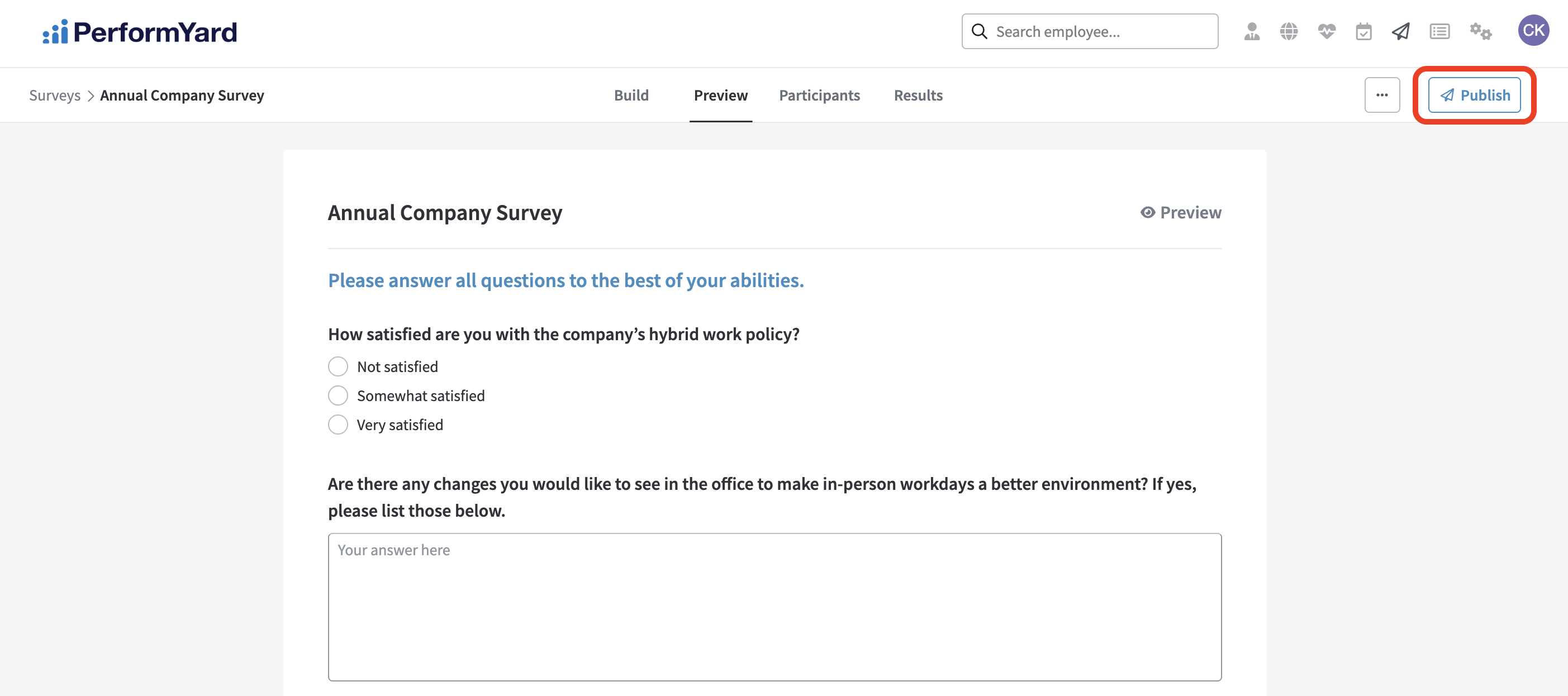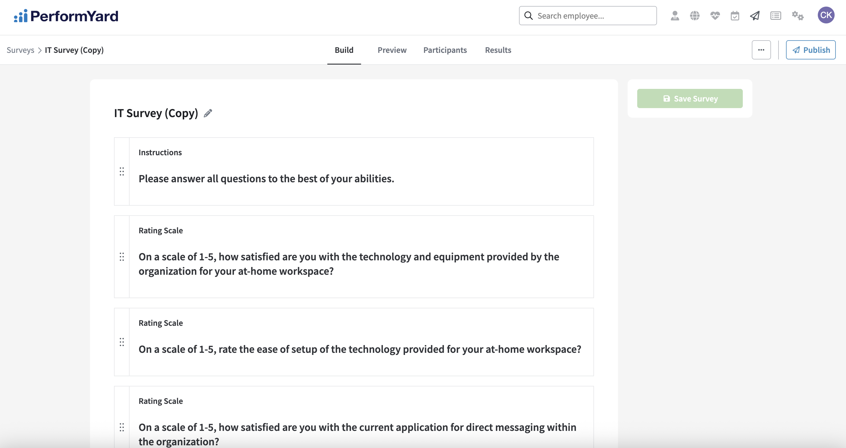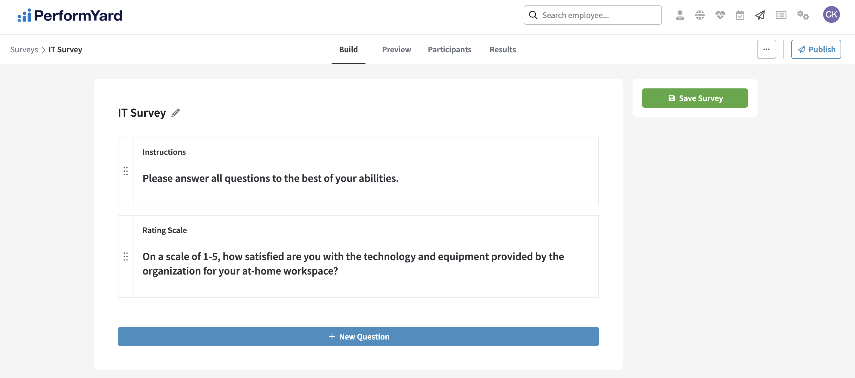 Whether you're preparing your organization's annual survey or collecting quick feedback on a specific topic, PerformYard provides a fast, flexible survey builder to help you gather input from your team. There are two primary ways to create a new survey. To get started, navigate to the Surveys home page.