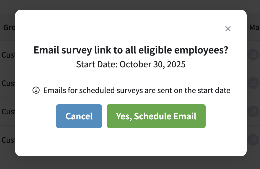 If you're planning ahead for something like an annual company survey, you can schedule the survey to open on a future date. This option allows you to prepare the survey in advance while controlling when it becomes available to participants. To do this, select the Schedule Start and End Date checkbox. Set your desired start date and, if applicable, the date it needs to close.
