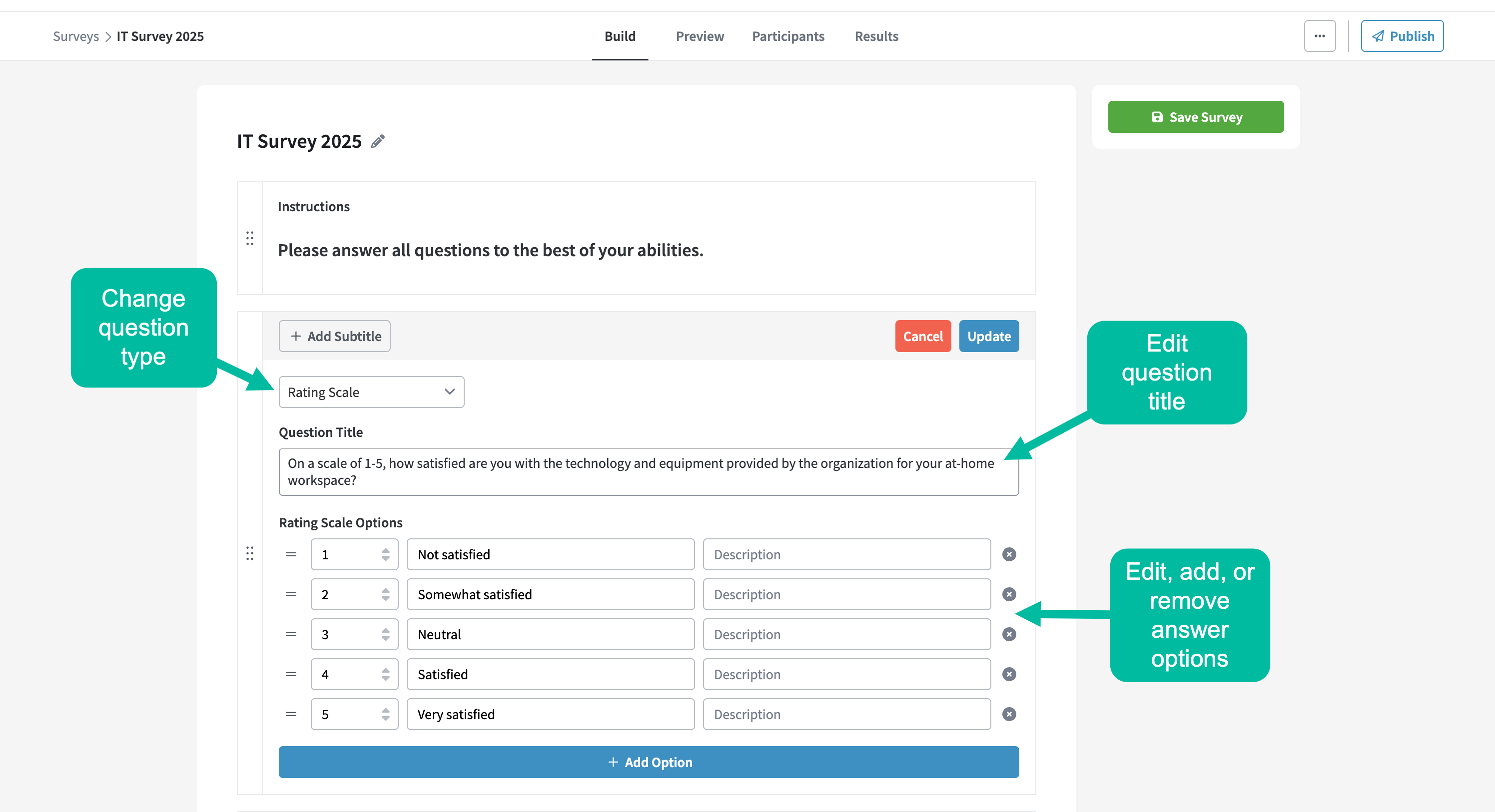 When edits are made to an Open survey, those changes will be reflected in the survey as soon as they are saved in the Build tab. The Results tab will also update to reflect changes made to the survey name, question titles, question order, and new or deleted questions.