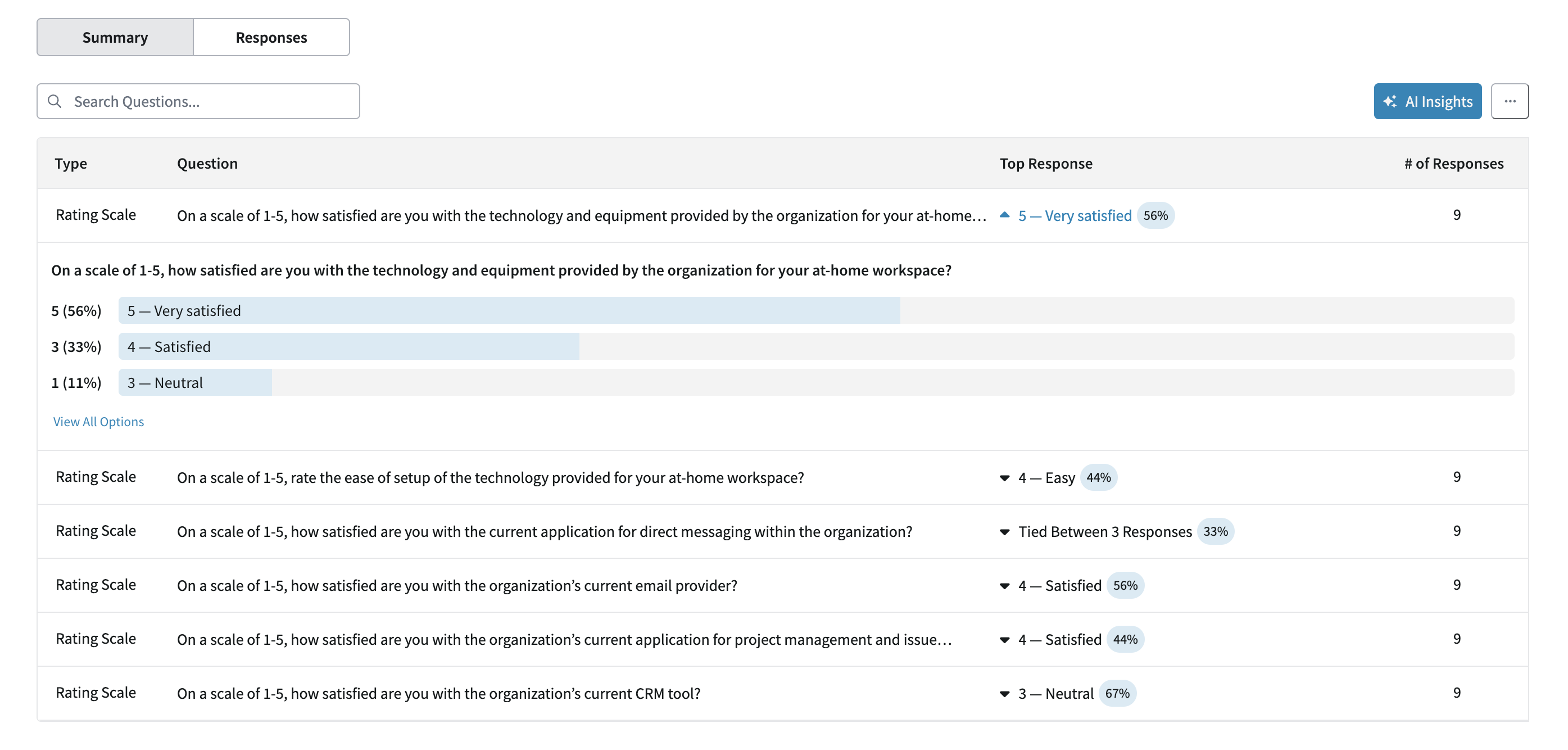 Below the overview section, users can toggle between two views to analyze their survey results in greater detail. The Summary view (default) shows an aggregate overview of how participants responded to each rating scale and multiple choice question included in the survey. To view the responses received for a specific question, click the top response information for the desired question row. The expanded row will only show submitted answers by default, but users can view the options that were available to choose from by clicking View All Options. The Summary view supports searching by question text and sorting by question type, question title, and quantity of responses received.