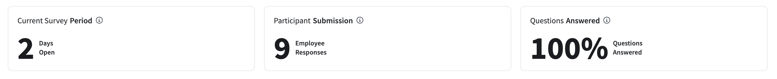 - Current Survey Period - The display of the current survey period varies based on the survey's status and setup. For Scheduled or Open surveys without a defined end date, the interface shows the number of days the survey has been open. For surveys with an end date, it shows the number of days remaining until the survey closes. This data will update daily for Open surveys. Once a survey has a Closed status, the display shows the total number of days the survey was active.