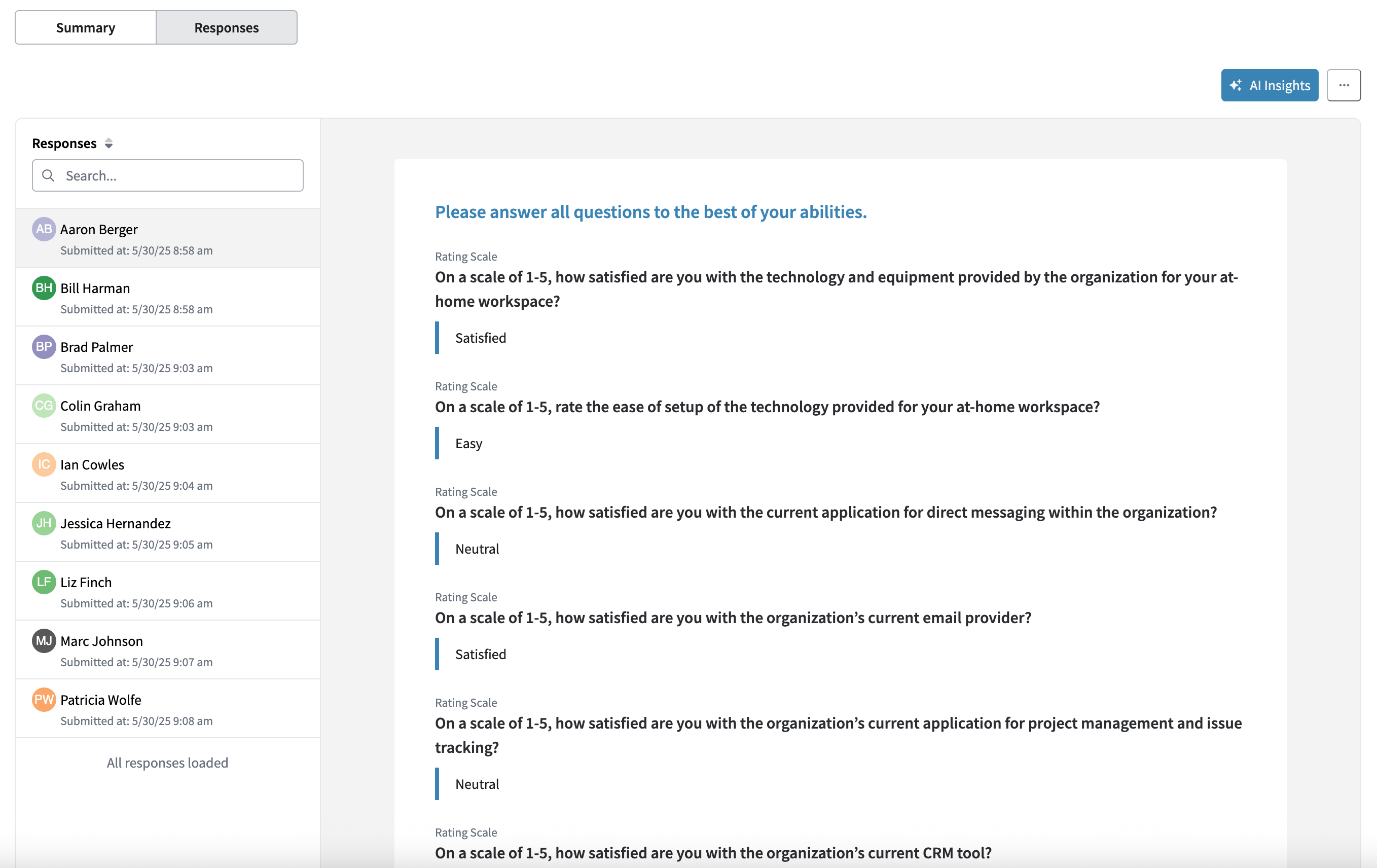 The Responses view offers a participant-by-participant breakdown, showing each individual's answers to the survey. This view supports searching by survey participant and sorting by submission date/time.