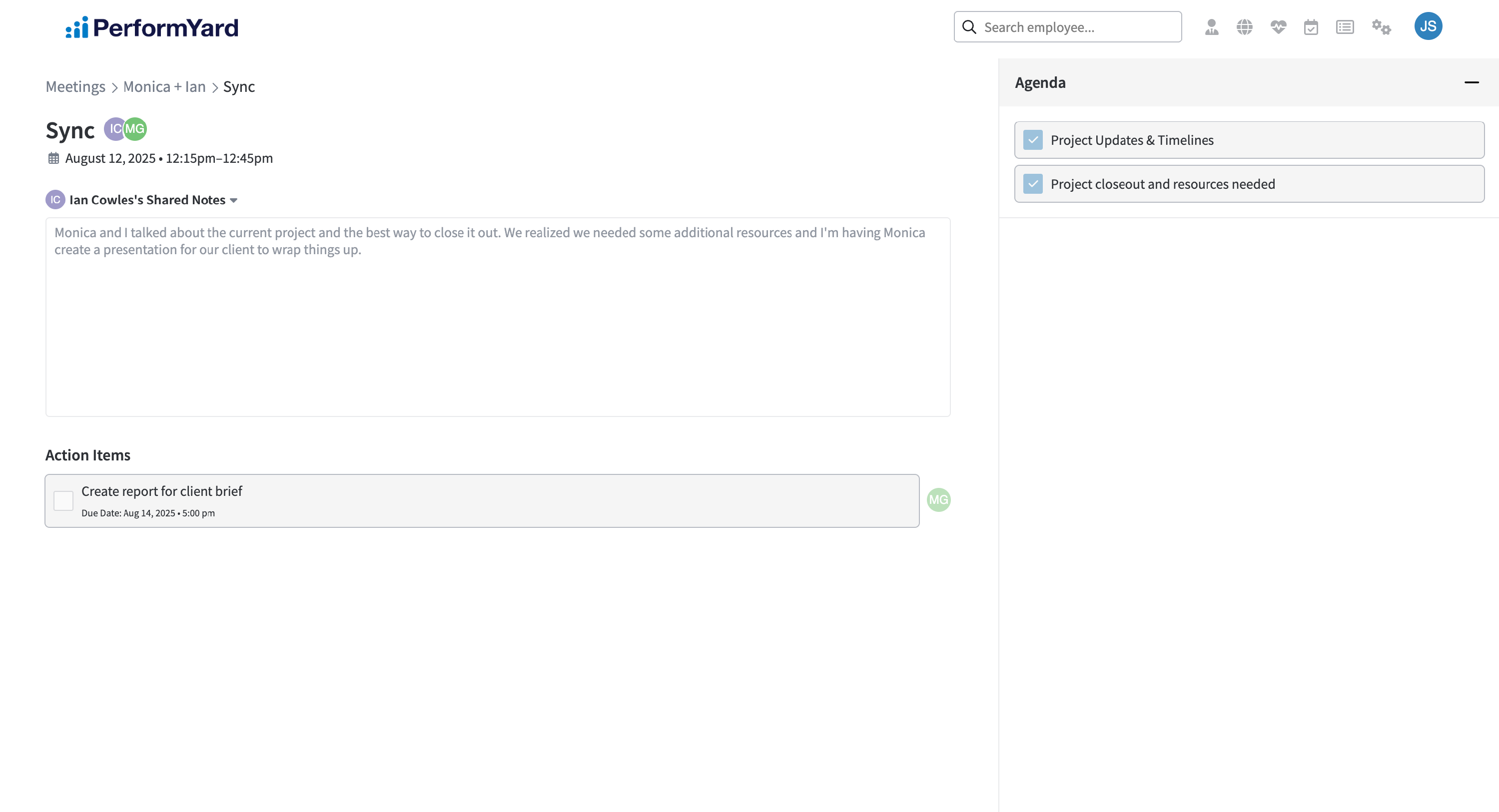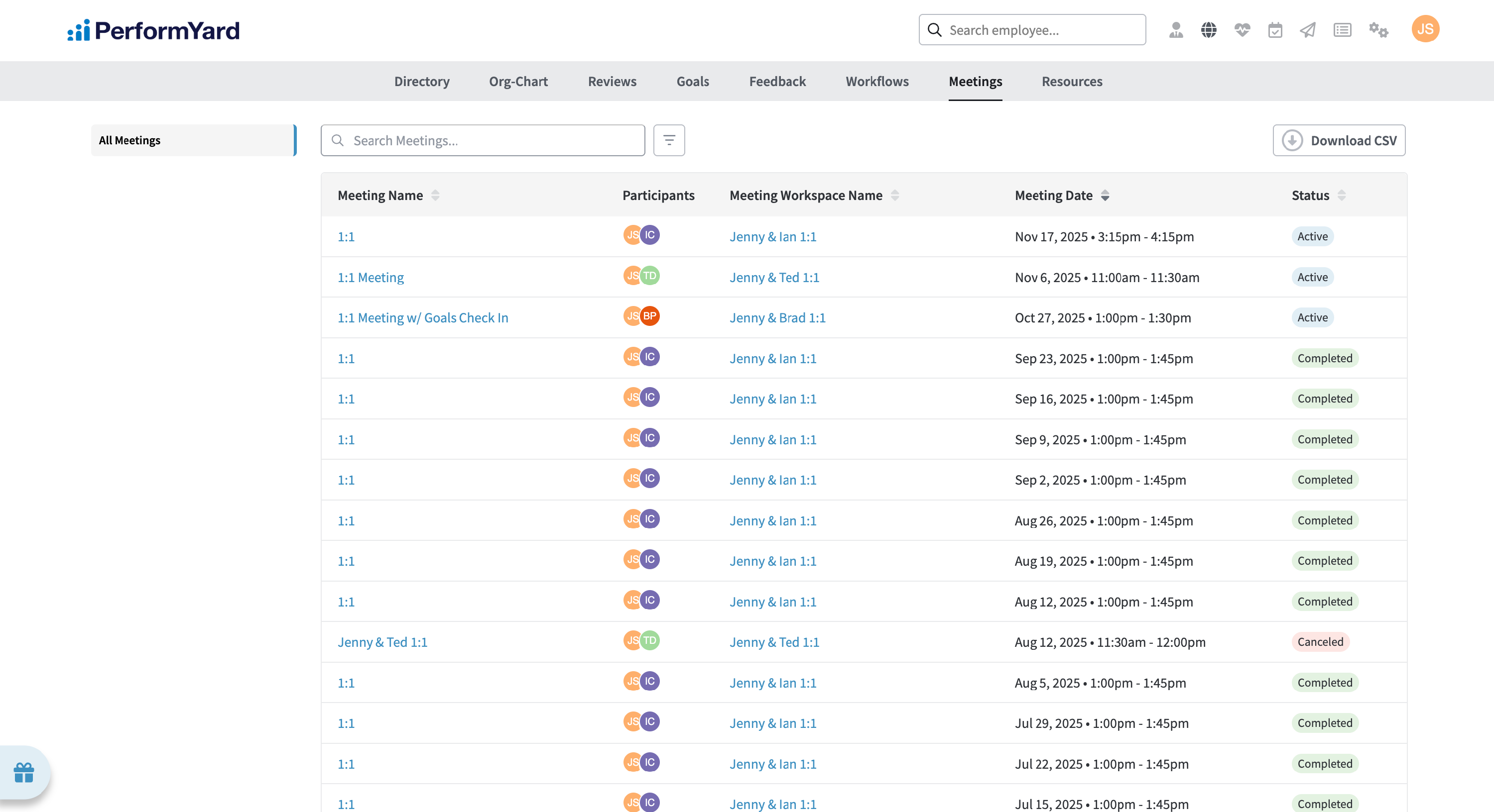 As a Billing administrator or administrator in PerformYard, you'll have access to a list of all meetings created across your organization. Found inside of Company Info, this list of meetings gives you comprehensive visibility into all meetings created across their organization, which should enable you to identify collaboration patterns, track meeting frequency across departments, and ensure managers are engaging with their direct reports on a regular cadence.