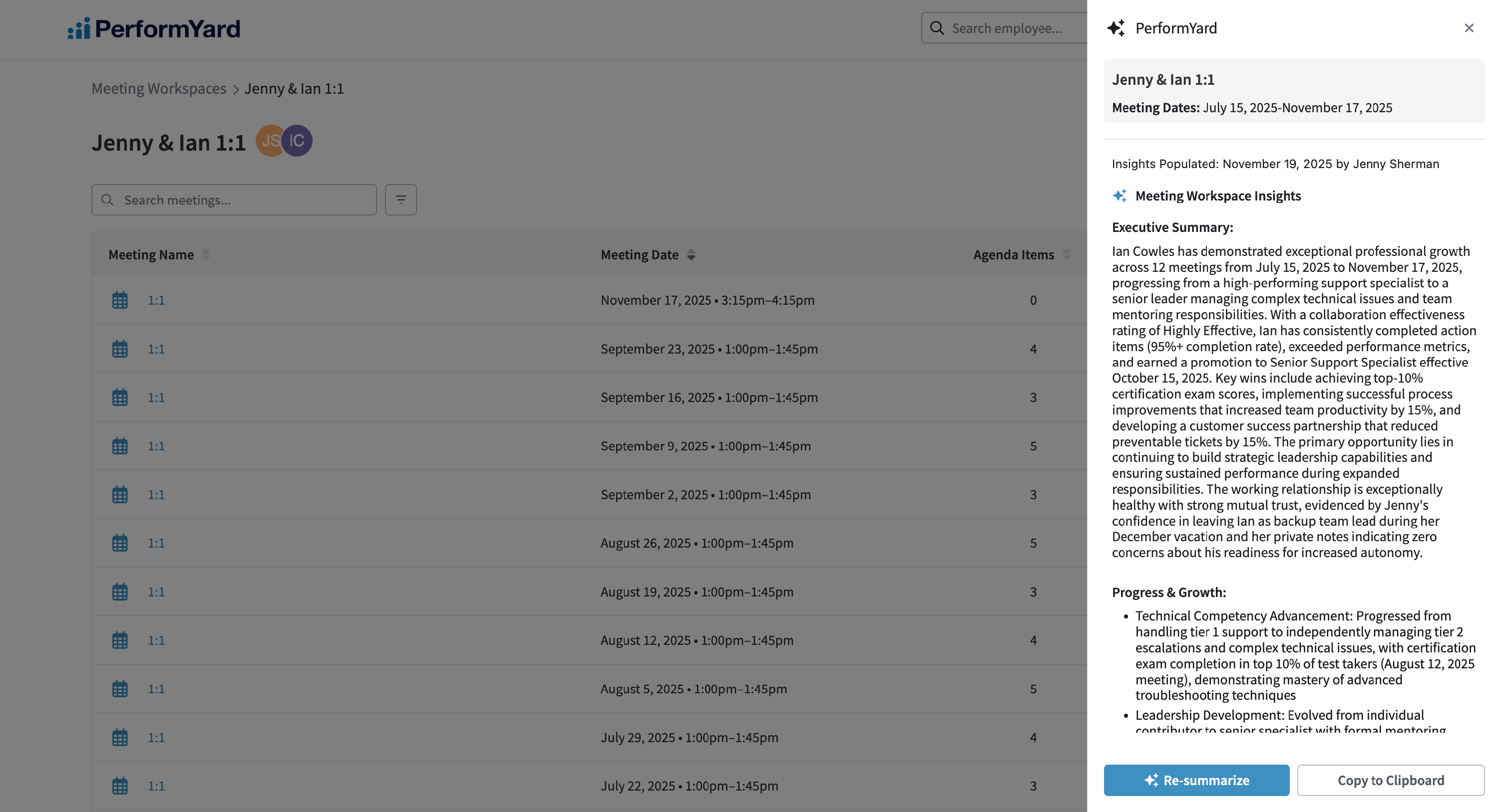 With a PerformYard Premium (formerly Enterprise) account, a PerformYard Meetings license and the AI Meeting Workspace Insights Assistant enabled, you can transform multiple meetings into clear, actionable insights, saving you valuable time while ensuring no important information is overlooked. By analyzing patterns across all submitted meetings and their content (agendas, action items, and notes), the assistant identifies progress, growth, wins, development areas and more, all aiming to provide a comprehensive picture of performance that might otherwise be difficult to extract from numerous individual meetings.