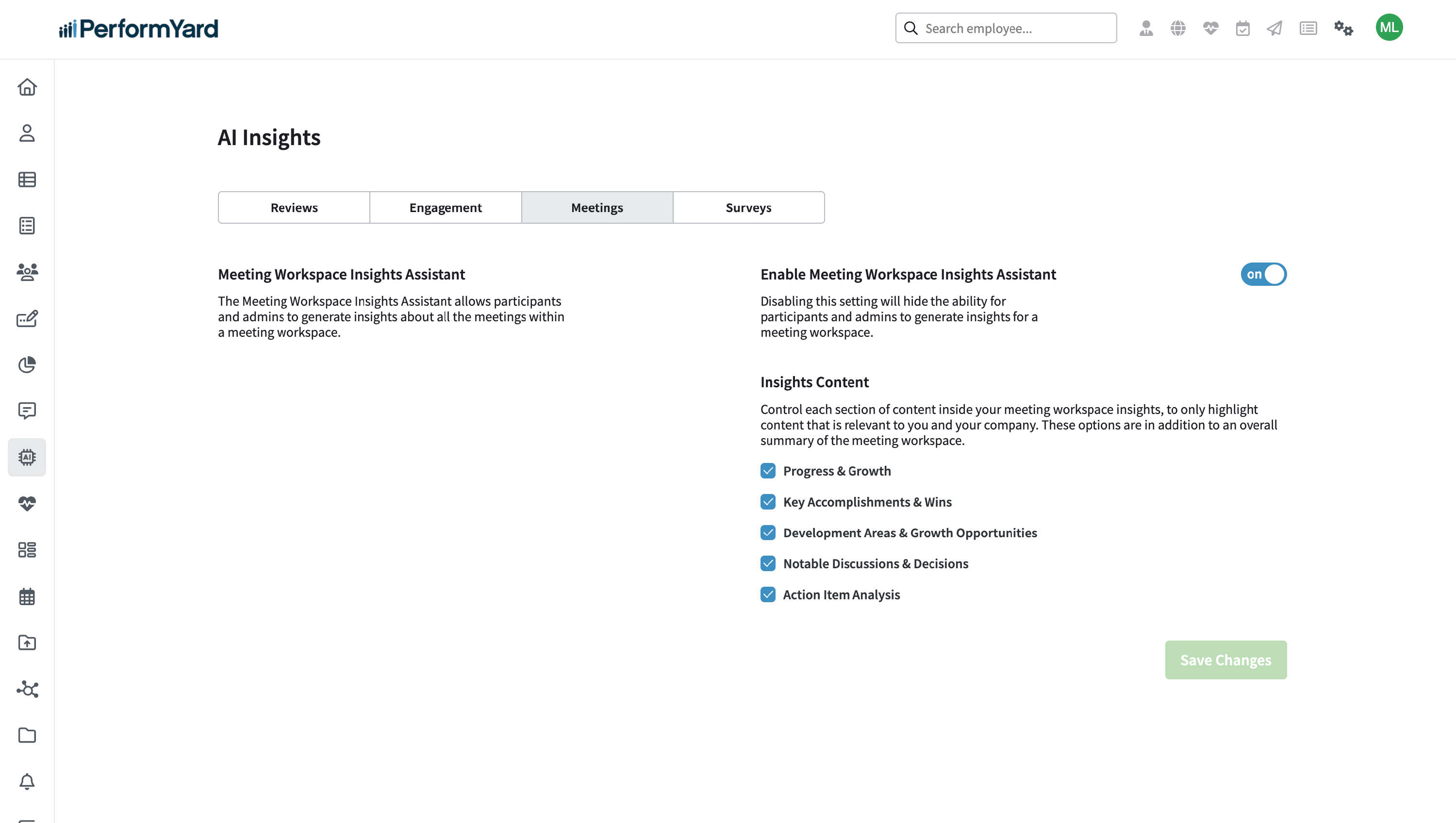 If you are on a PerformYard Premium (formerly Enterprise) account and have a PerformYard Meetings license, as an administrator, you have the ability to tailor the AI Meeting Workspace Insights Assistant to your organization's needs. You can configure key settings such as enabling or disabling the feature and which sections to include in the insights. This feature is available in your administration settings under AI Assistants → AI Insights → Meetings.