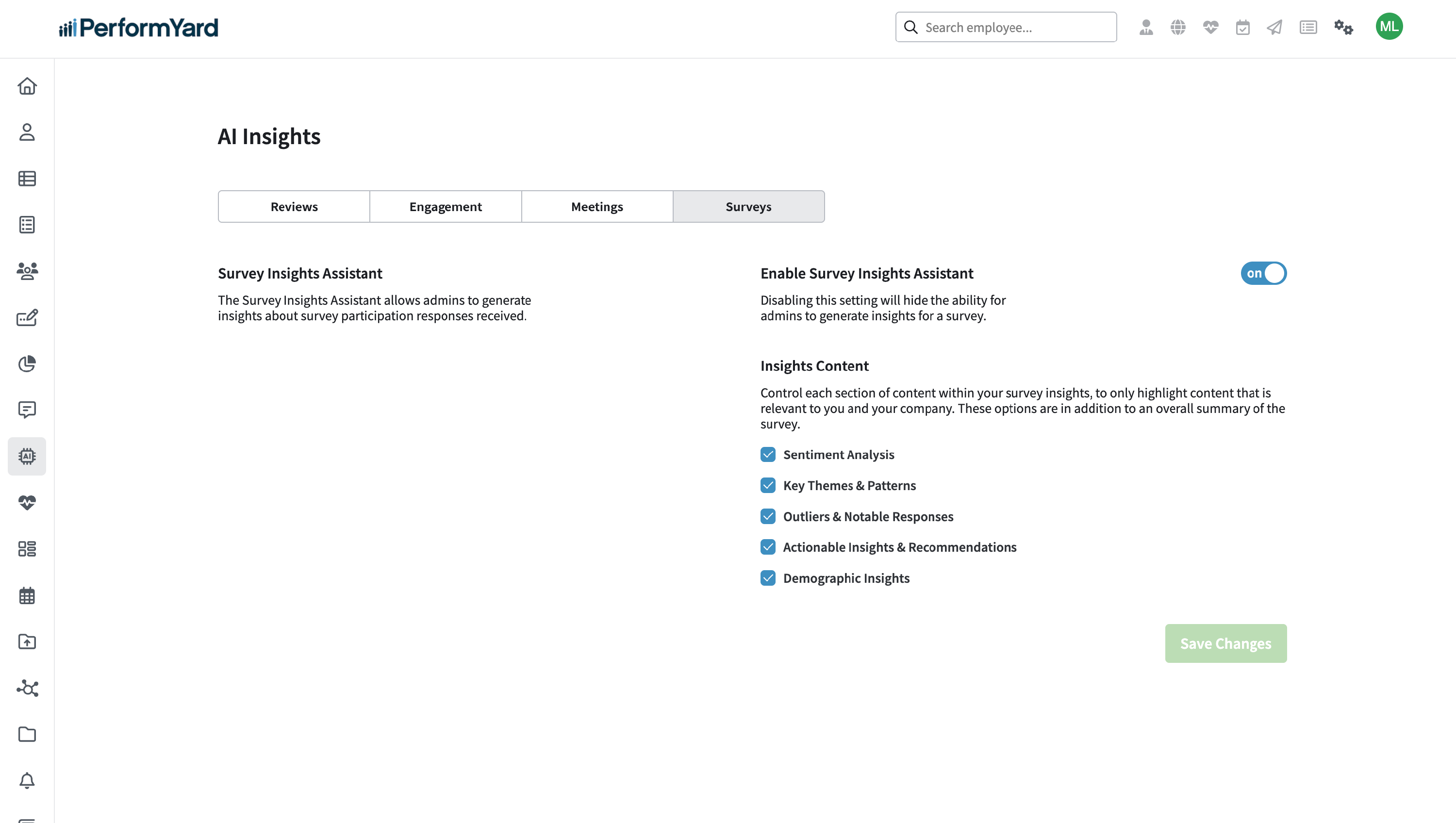 If you are on a PerformYard Premium (formerly Enterprise) account and have a PerformYard Surveys license, as an administrator, you have the ability to tailor the AI Survey Insights Assistant to your organization's needs. You can configure key settings such as enabling or disabling the feature and which sections to include in the insights. This feature is available in your administration settings under AI Assistants → AI Insights → Surveys.