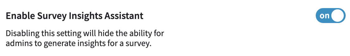 Administrators have the ability to enable or disable the AI Survey Insights Assistant feature for their entire organization. This feature can be turned on or off based on the needs of your team or company policies. To disable the AI Survey Insights Assistant for all surveys, simply set the toggle to “off”. When the feature is disabled, users who can access the Surveys module will not have the option to generate insights within the Survey Detail pages.