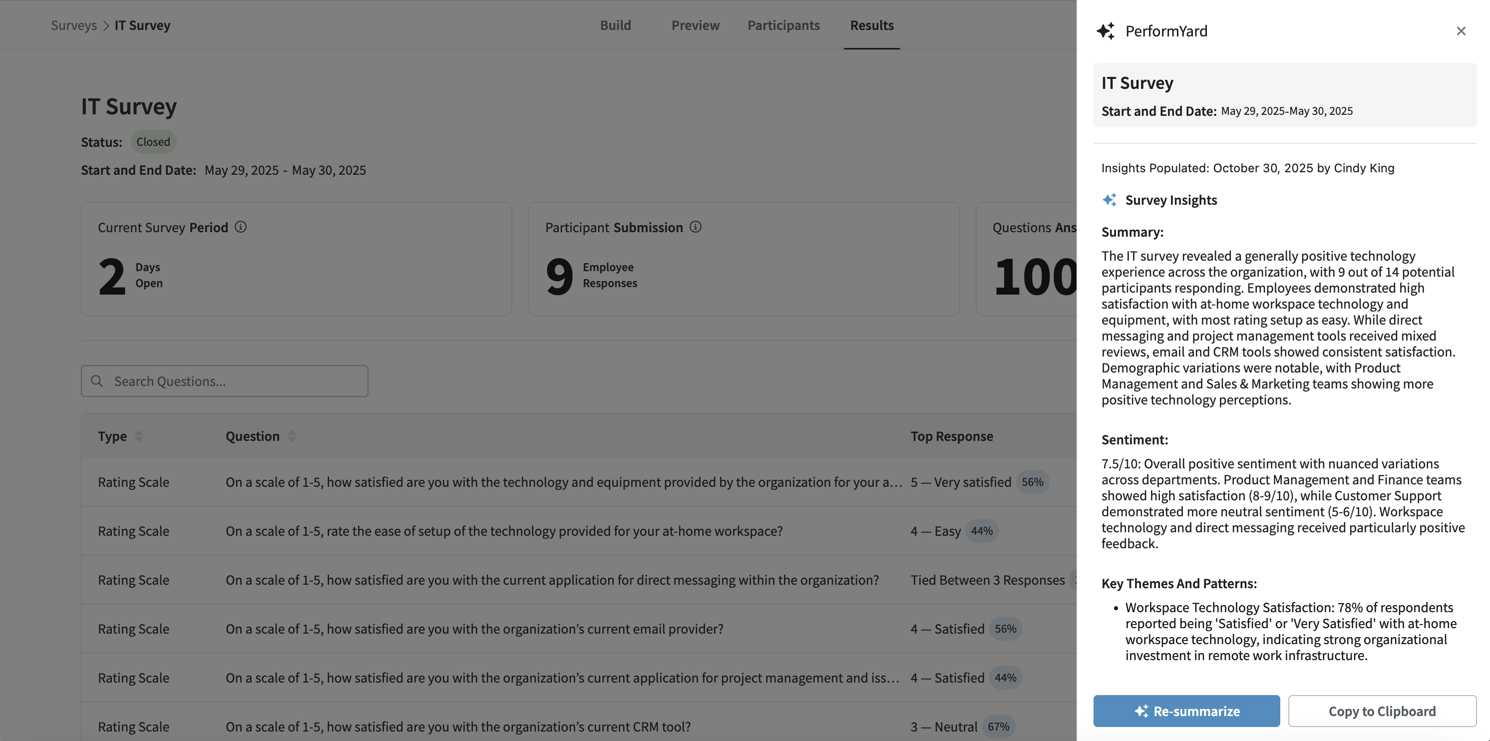 With a PerformYard Enterprise account, a PerformYard Surveys license and the AI Survey Insights Assistant enabled, you can transform the responses submitted by participants into clear, actionable insights in a matter of minutes. By analyzing the questions asked and patterns across the responses submitted, the assistant identifies the overall sentiment, key themes, outliers, notable responses, actionable recommendations, and demographic insights to provide you with the "big picture" and direction forward - saving you the time and labor that would've otherwise been required to analyze and identify this information manually.