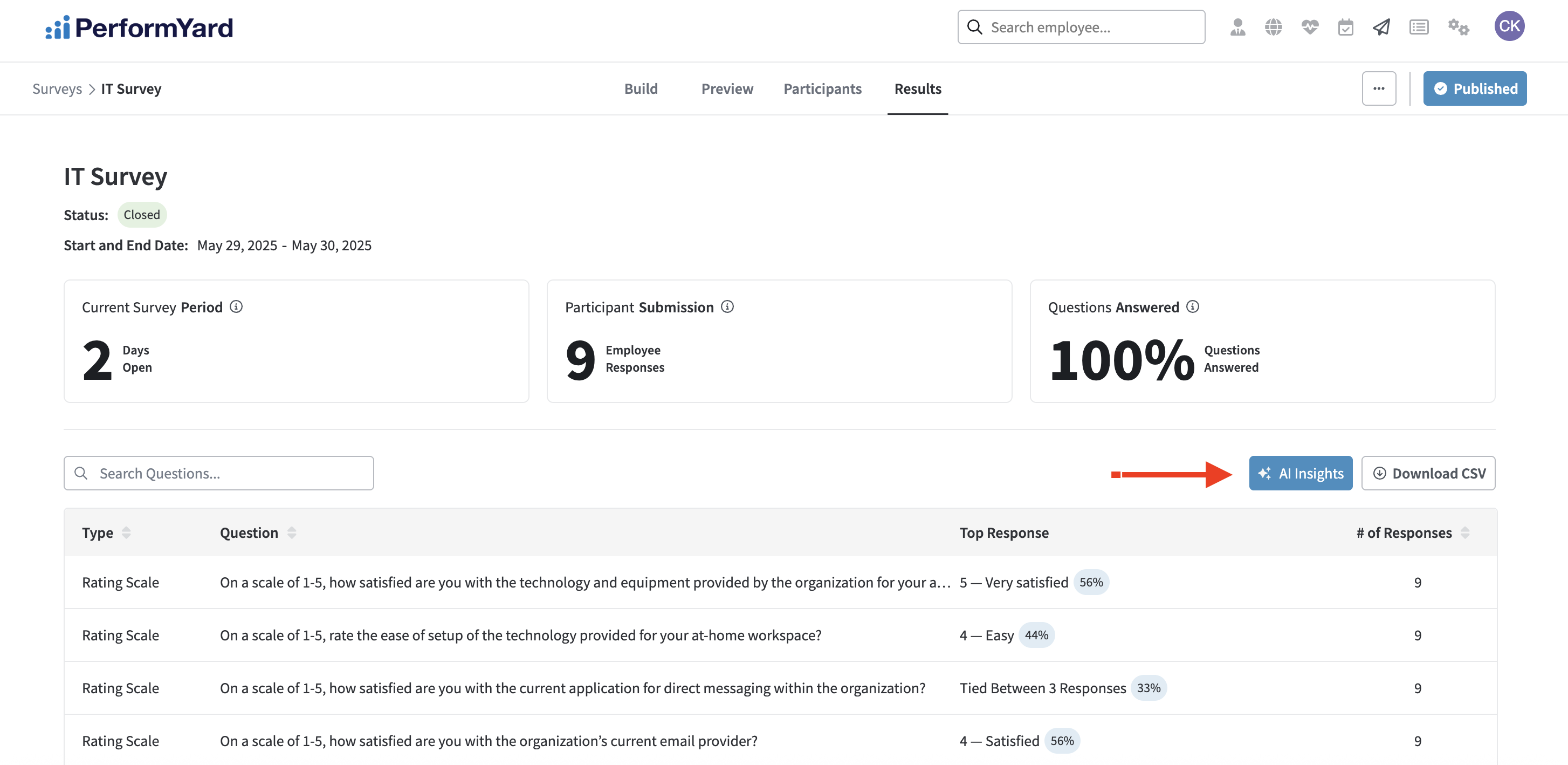 Once the AI Survey Insights Assistant is enabled, you can generate insights by navigating to the Results tab for the desired Survey Detail page. Once an Open survey has received at least one participant response, a blue AI Insights button will display towards the top right corner of the Questions Table.