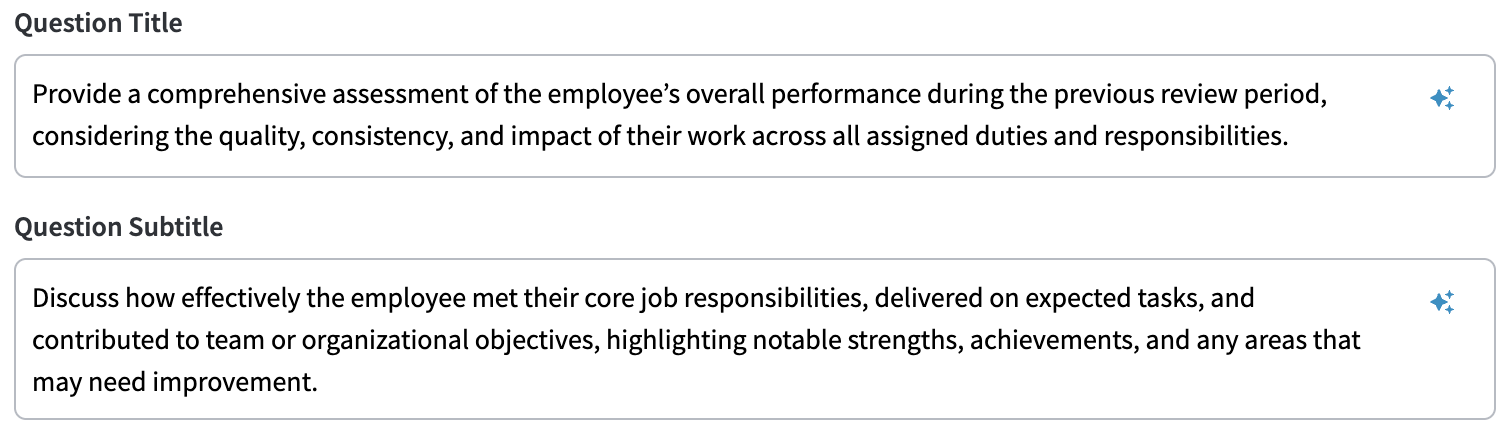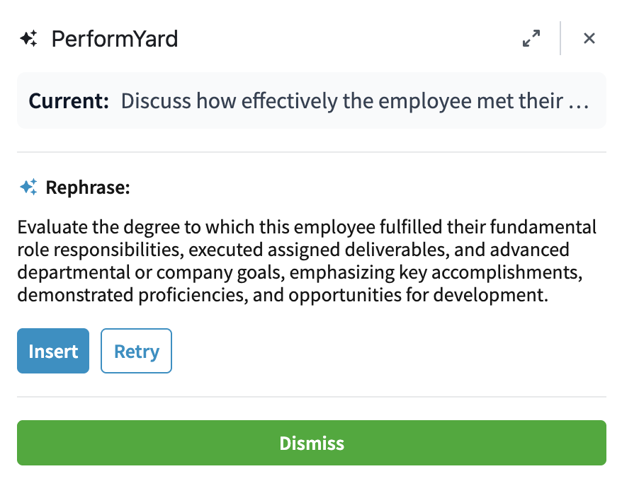 With a PerformYard Premium (formerly Enterprise) account and the AI Form Question Rephrase Assistant, rephrasing your form questions and subtitles is simple and seamless. After typing your response, if prompted, the assistant will suggest a rephrase that aligns with your company's language policies and culture. You can then easily insert it, make adjustments, or request a new suggestion for a better fit.