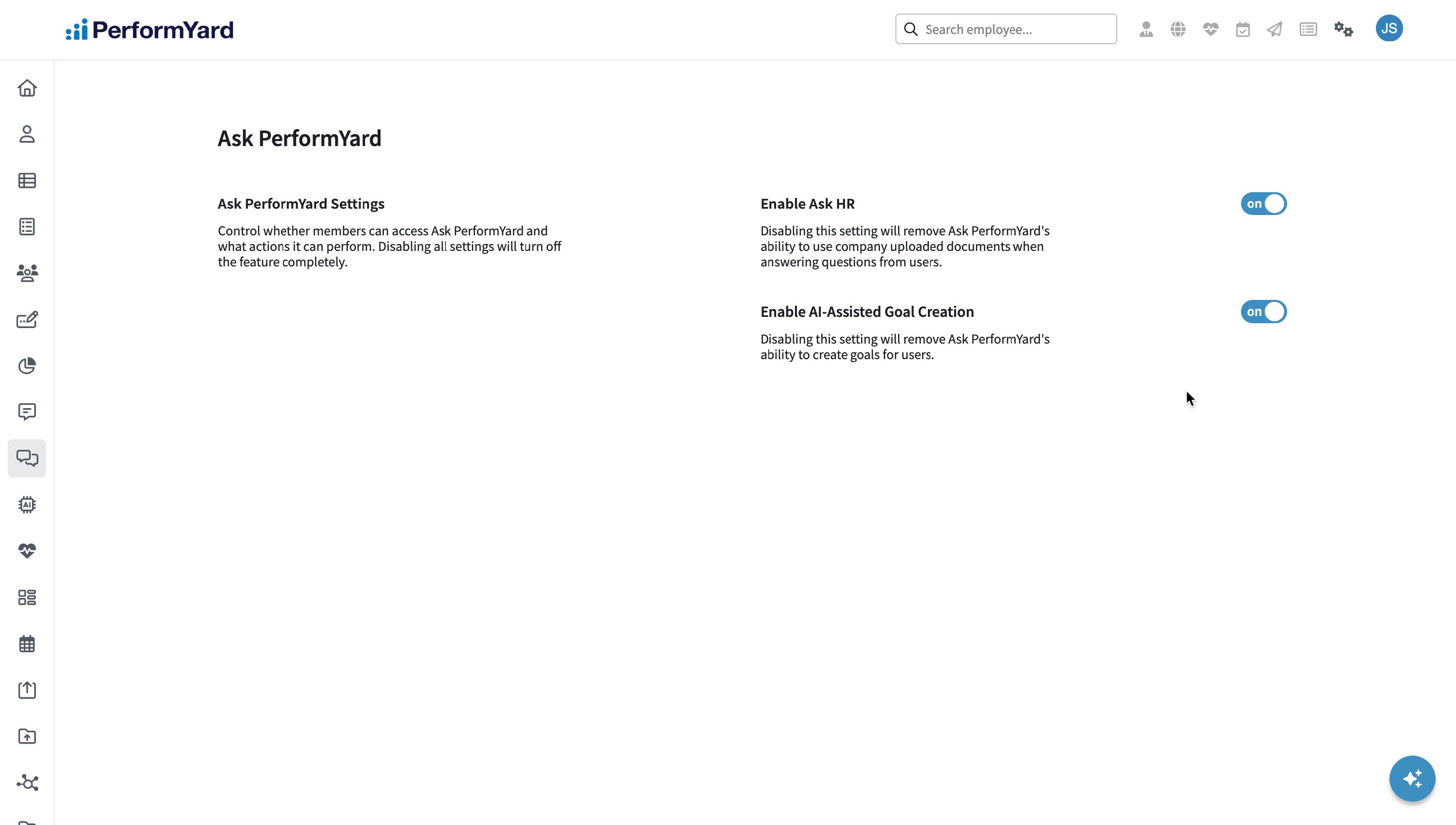 If you are on a PerformYard Premium (formerly Enterprise) account, as an administrator, you have the ability to tailor Ask PerformYard to your organization's needs. You can configure key settings, including enabling or disabling specific Ask PerformYard features like Ask HR.This feature is available in your administration settings under Ask PerformYard.