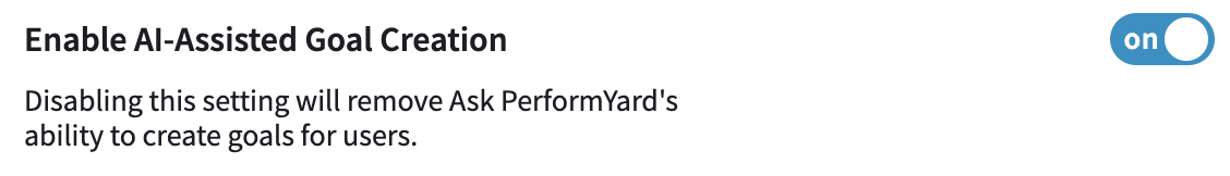 Administrators can enable or disable AI-Assisted Goal Creation for the entire organization based on team needs or company policies. When disabled, all users, including admins, managers, and employees, will be unable to create goals through Ask PerformYard.