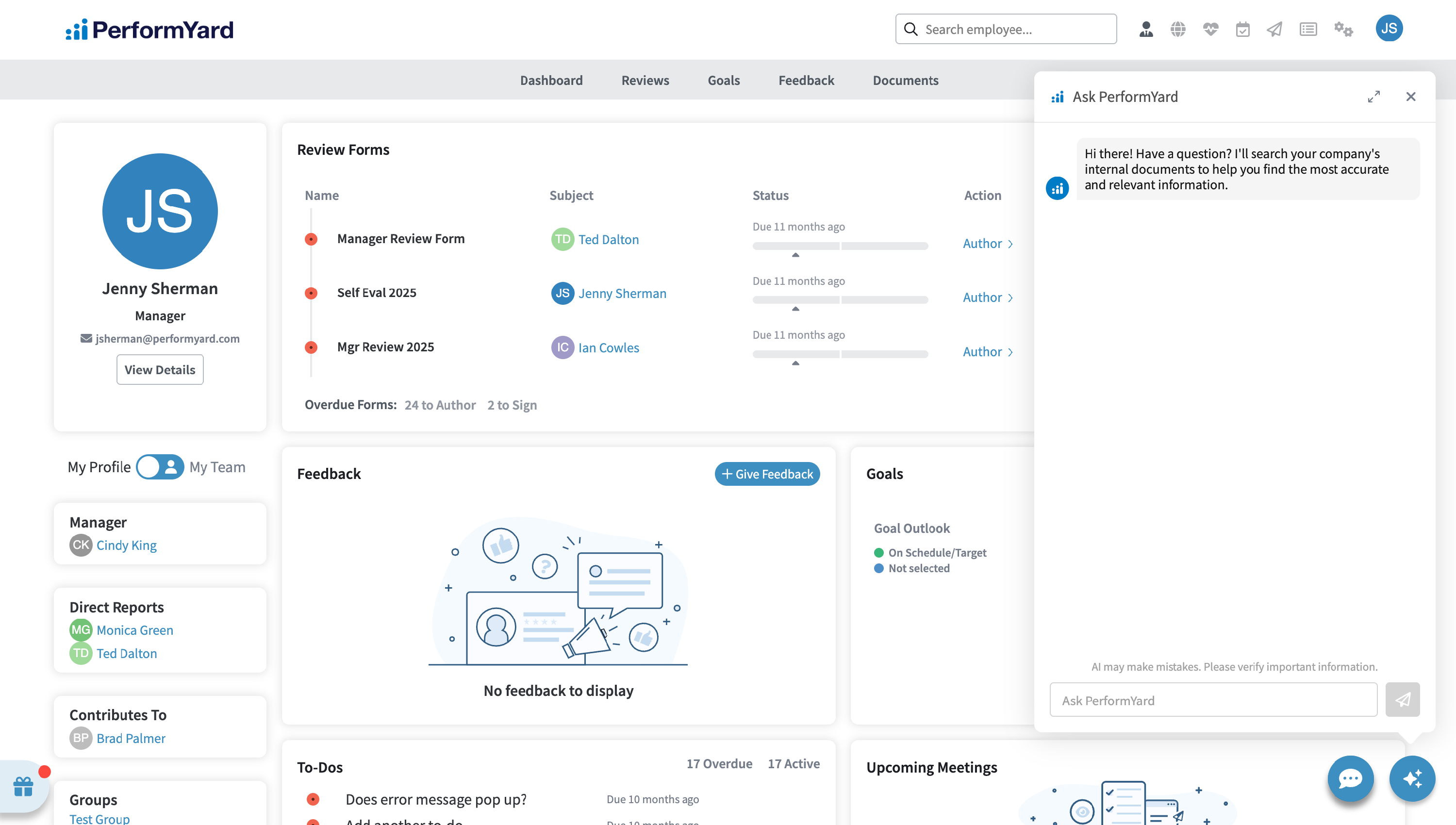 Ask PerformYard is your AI assistant for performance management. Available for PerformYard Premium (formerly Enterprise) accounts, Ask PerformYard helps answer questions and guide you through tasks using your organization's own resources. The Ask HR feature within Ask PerformYard allows administrators to build a custom knowledge base using company documents, enabling employees to get instant, accurate answers to common questions about policies, procedures, and benefits. Access Ask PerformYard anytime via the blue AI button in the bottom right corner of most pages.