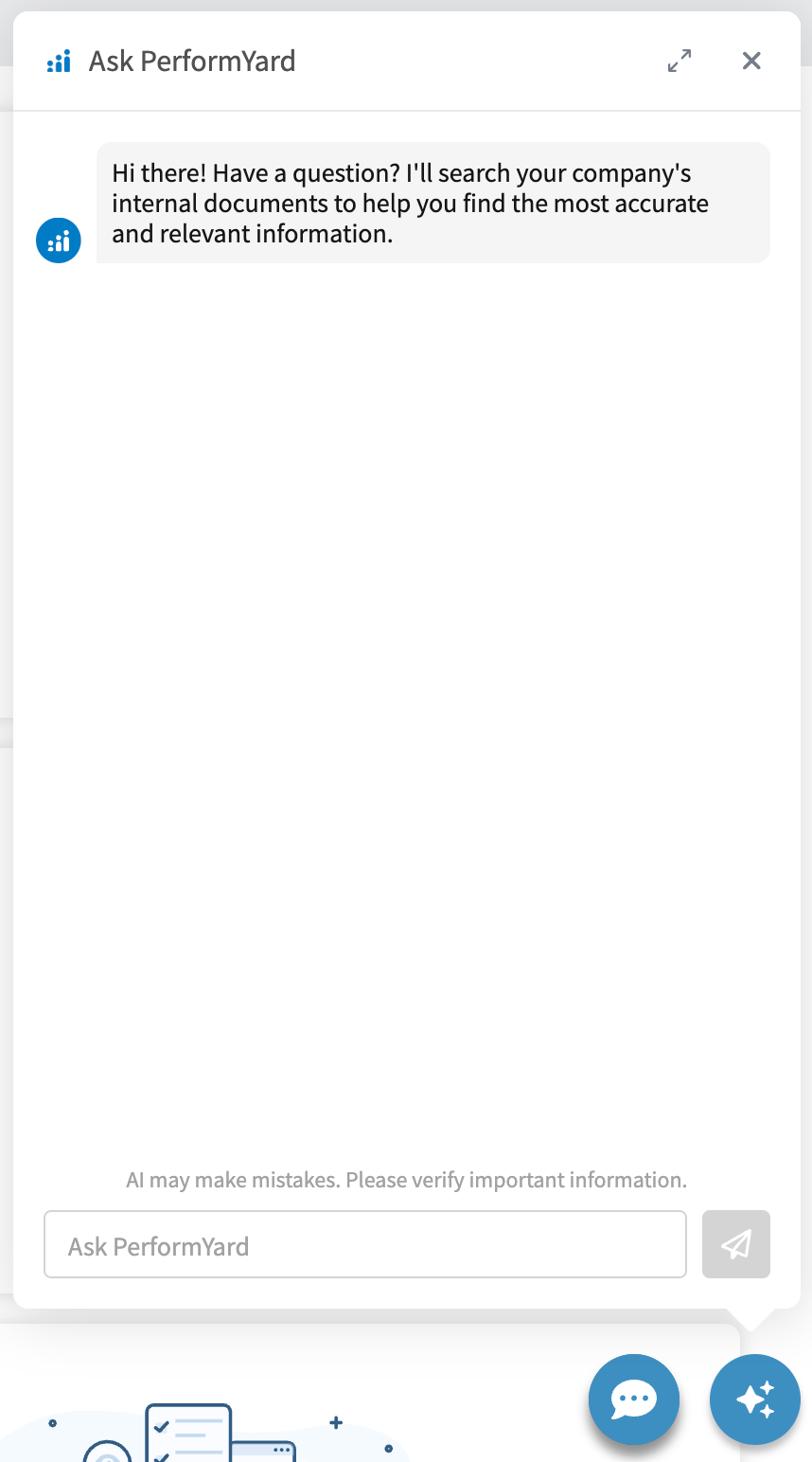 Ask PerformYard is accessible from the blue AI button in the bottom right corner of most pages. Click the button to open the chat interface, where you can ask questions and receive answers based on your organization's Ask HR knowledge base.