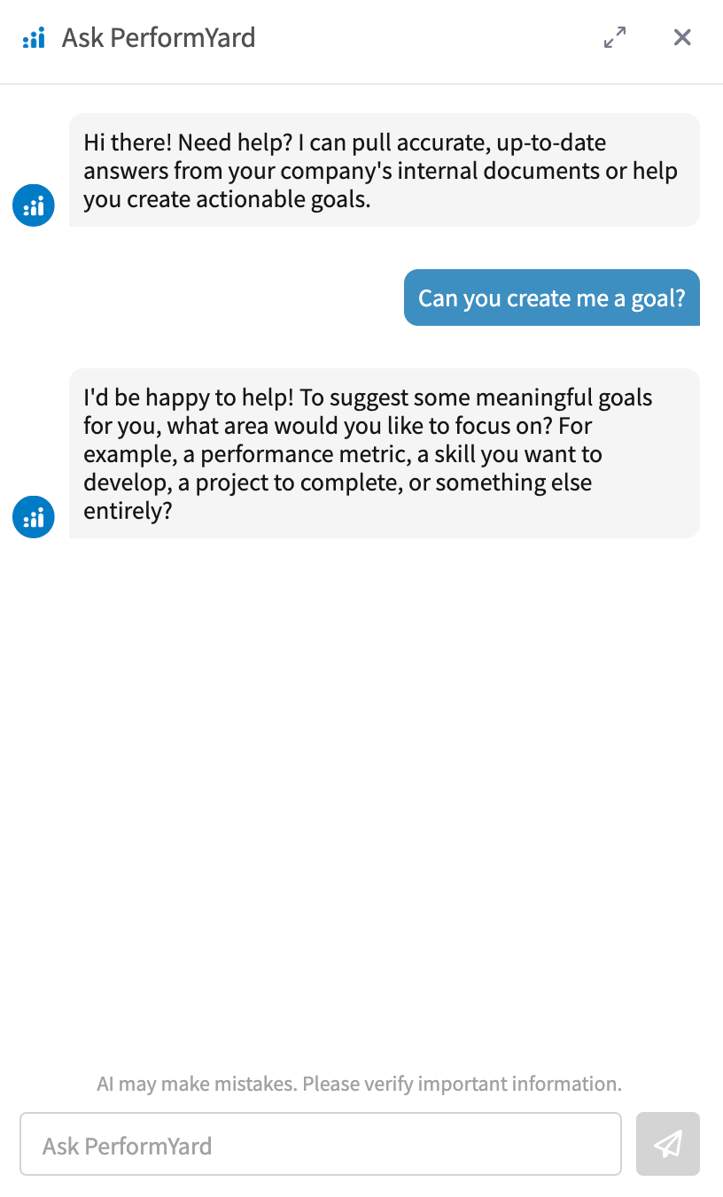 Once the chat interface is open, you can ask Ask PerformYard to help you create goals by typing a request such as "Can you create me a goal?" or "Create a goal for [employee name]." To generate the best suggestions, Ask PerformYard uses a few key pieces of context: the goal type, the focus area, who the goal is for, and the desired timeframe. If you include all of this in your initial message, Ask PerformYard will get straight to work and suggest up to three tailored goals. If some or all of that context is missing, Ask PerformYard will ask a few short questions to gather what it needs before generating your suggestions.