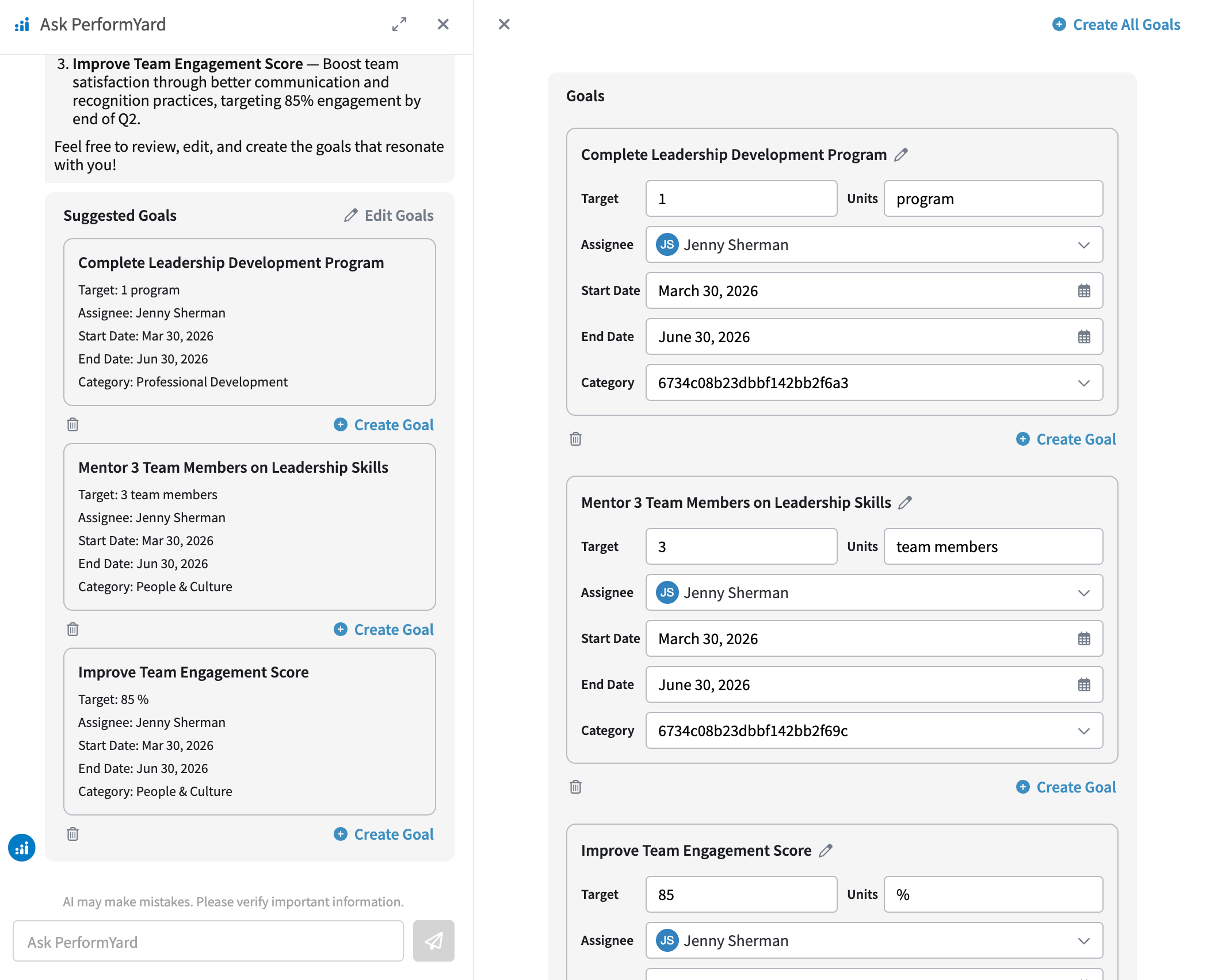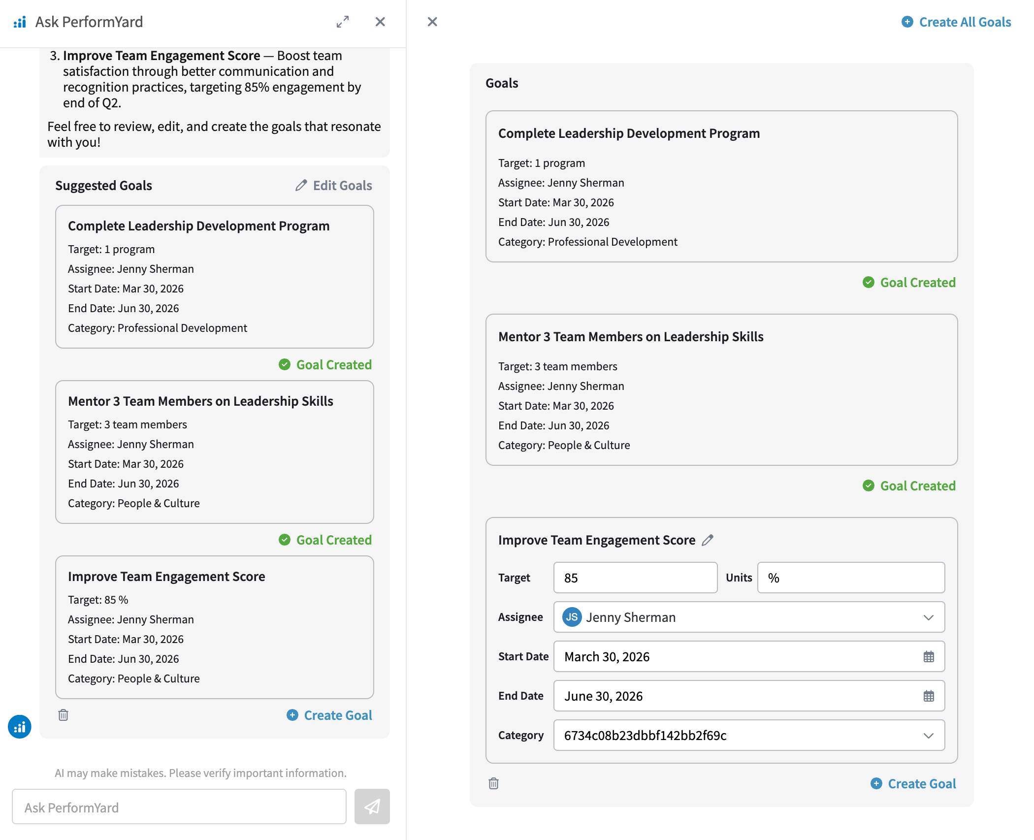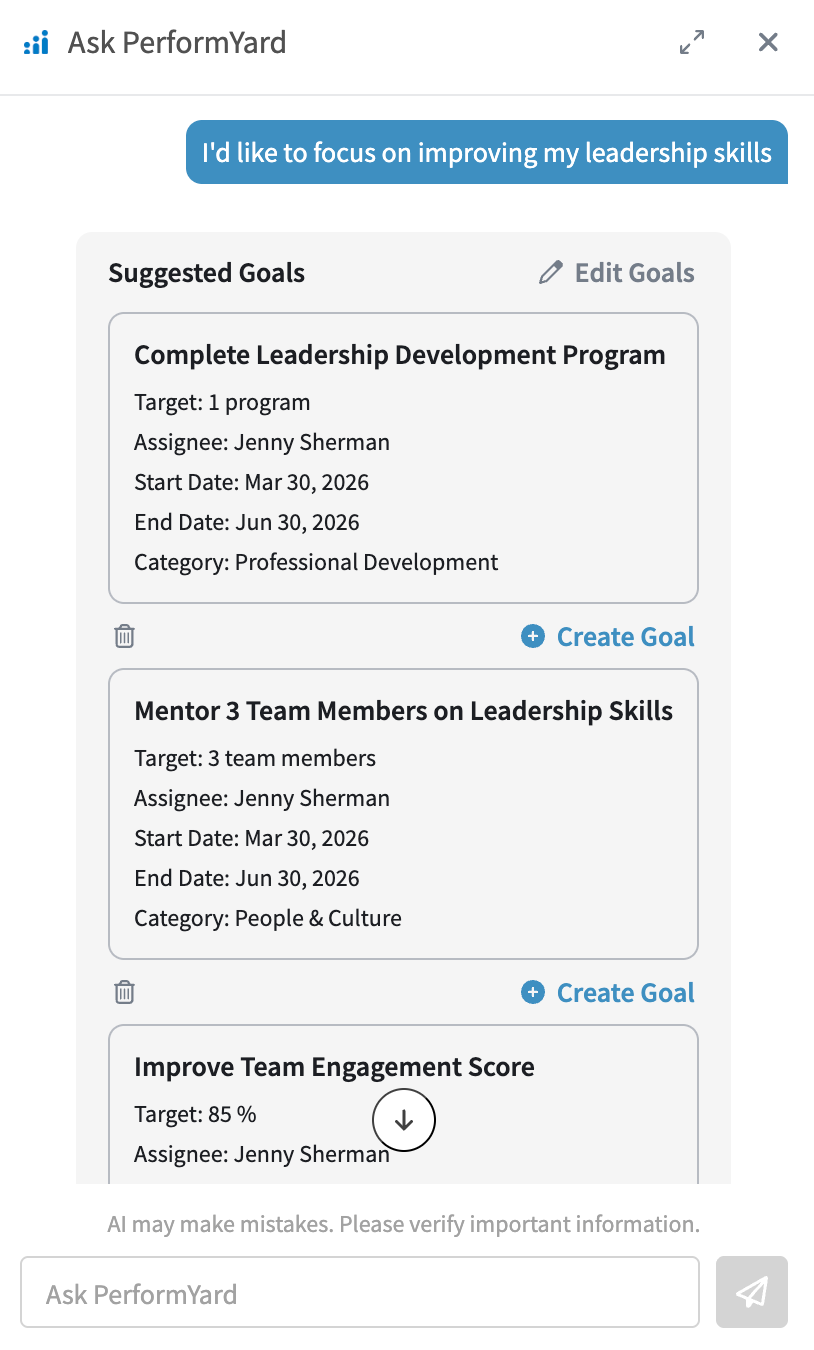 Once Ask PerformYard has the context it needs, it combines that information with relevant data from your organization, such as the assignee's job title and existing goals, to suggest up to five tailored goals. Each suggested goal includes a name, target, assignee, and start and end date. From there, you can create a goal as-is directly from the chat window, remove any suggestions you don't need, or click "Edit Goals" to fine-tune the details before creating them.