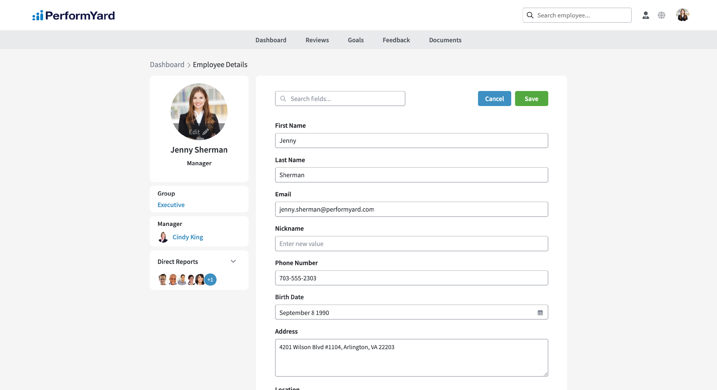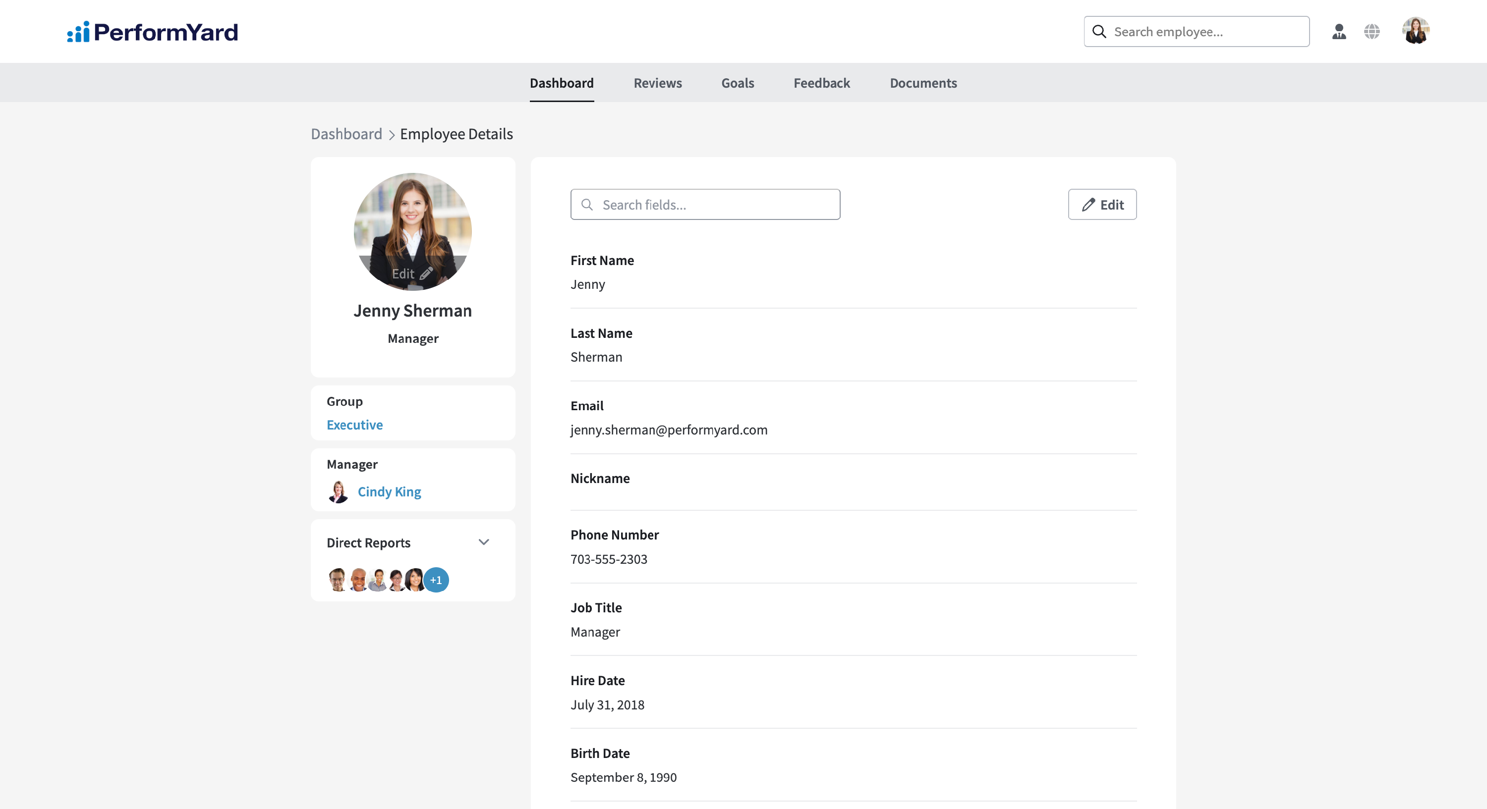 The Employee Details page in PerformYard provides a comprehensive view of your personal and professional information. You can access it by clicking the View Details button located on the left side of your dashboard, just beneath your profile picture, name, title, and email. On the Employee Details page, your basic details, such as name, title, manager, and direct reports, are displayed on the left side, below your profile image. On the right, you’ll find additional information related to your account. Please note that the visibility and management of these data fields are controlled by your system administrators.
