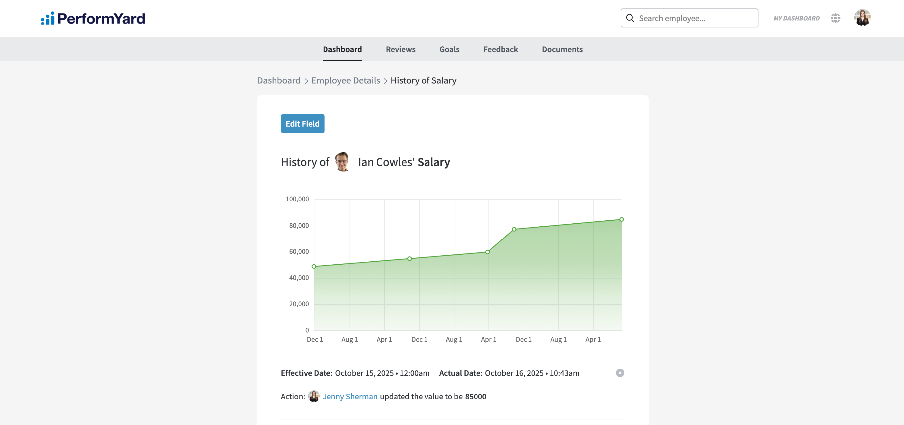 Additionally, each field title is clickable and links to a detailed history page, where you can view past changes made to that field. On these pages, you can also update the field, specify an “as of” date for the change, and include any relevant comments or context.